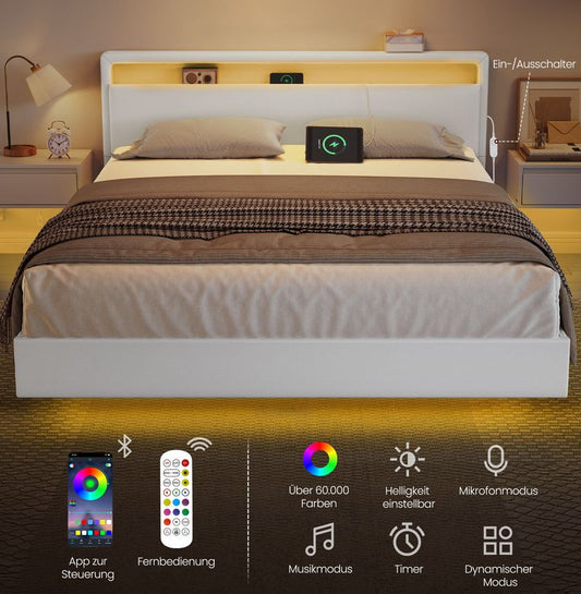Διπλό Κρεβάτι 140 x 200 εκ και 160 x 200 εκ Επενδυμένο με Δέρμα με LED φωτισμό και Βάση φόρτισης κεφαλάρι με επένδυση RM-B864W01