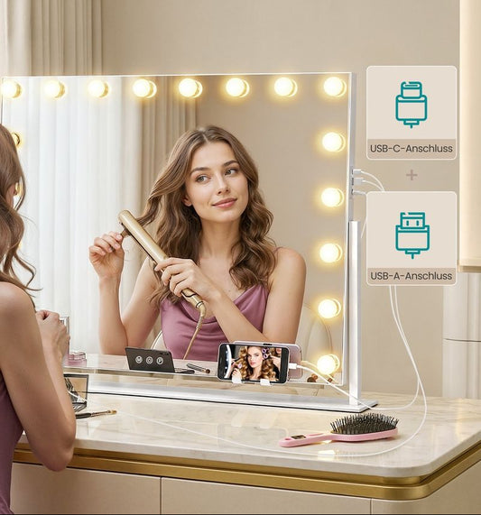 Μεγάλος Καθρέφτης Μακιγιάζ Φορητός για Τραπέζι Μπουντουάρ 80x60 εκ Περιστρεφόμενος με LED Ρυθμιζόμενο Φωτισμό και Θύρες Φόρτισης LW-M003WC02