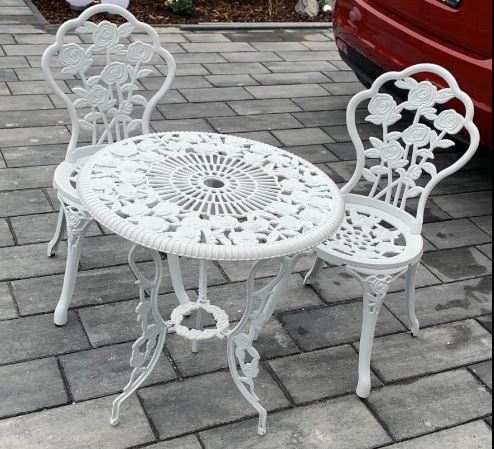 Terrassen-Gartenmöbel, Vintage-Aluminium-Bistrotisch-Set 142166–142164
