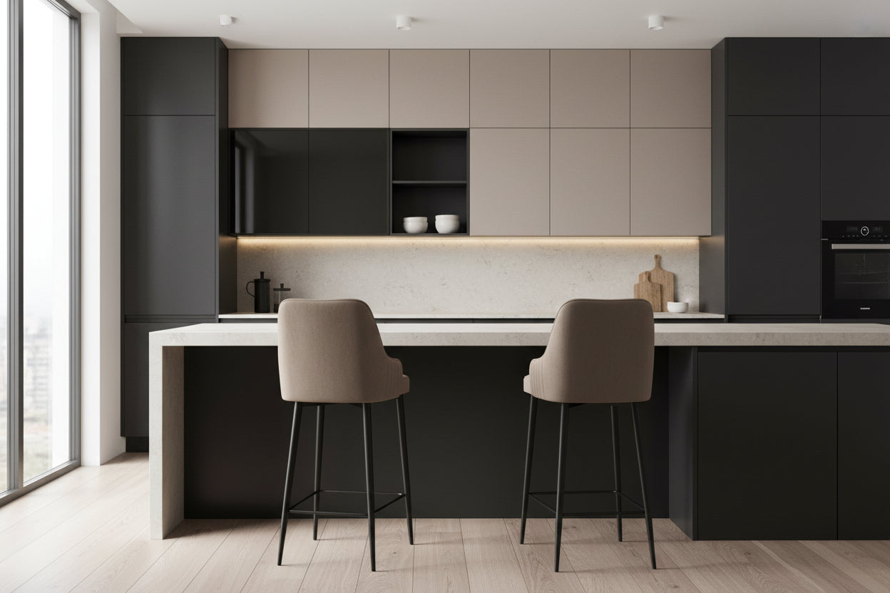 Εκλεπτυσμένος Σχεδιασμός: Με κομψό μεταλλικό σκελετό και πολυτελές ύφασμα Babyface, αυτά τα σκαμπό αποπνέουν κομψότητα και στυλ που ταιριάζουν σε κάθε διακόσμηση. Ο συνδυασμός καπουτσίνο και μαύρου προσθέτει μια μοντέρνα πινελιά.