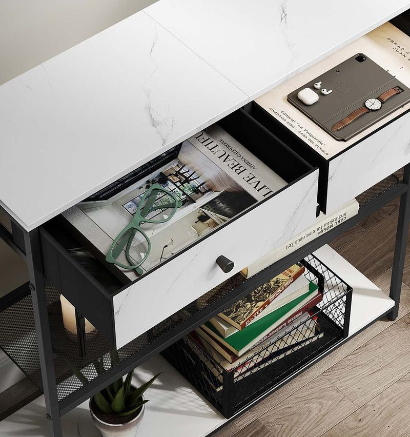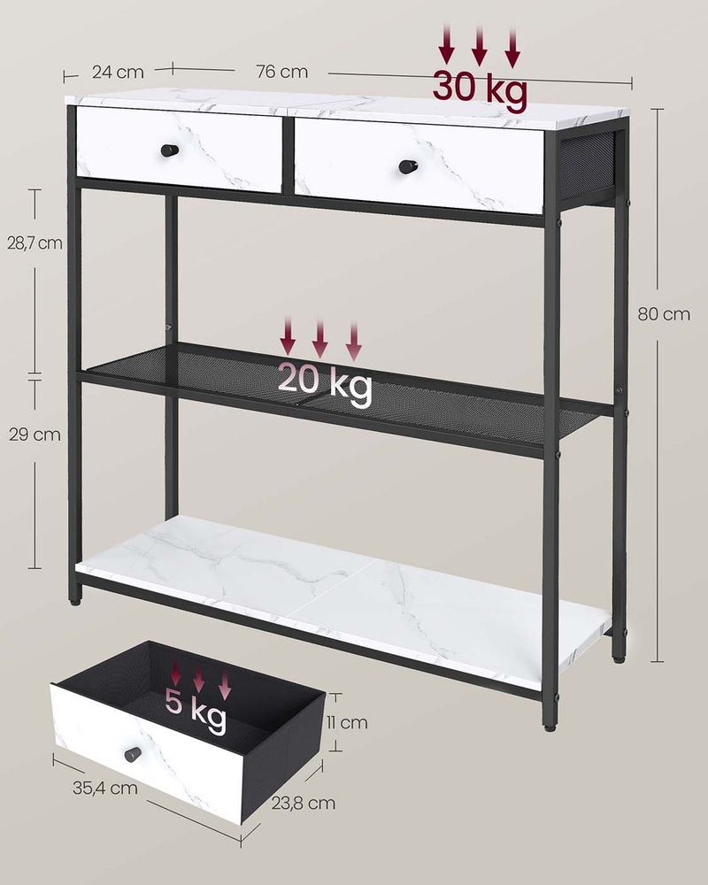 - Ανθεκτικό και σταθερό: Κατασκευασμένο από μοριοσανίδα και χάλυβα υψηλής ποιότητας, το τραπέζι διαδρόμου υποστηρίζει έως και 30 κιλά στο πάνω μέρος, 20 κιλά ανά κάτω ράφι και 5 κιλά ανά συρτάρι. Τα ρυθμιζόμενα πόδια εξασφαλίζουν σταθερότητα ακόμα και σε ανώμαλα δάπεδα.