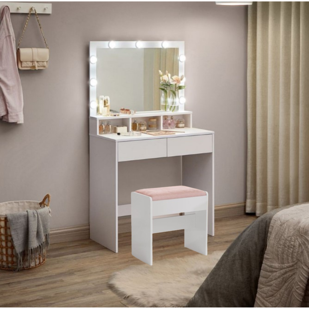 Dank seiner klaren Linien, der weißen Farbe und dem modernen Look passt dieser Schminktisch perfekt in Ihr Schlafzimmer. In der Ecke oder neben dem Bett? Das ist deine Entscheidung!