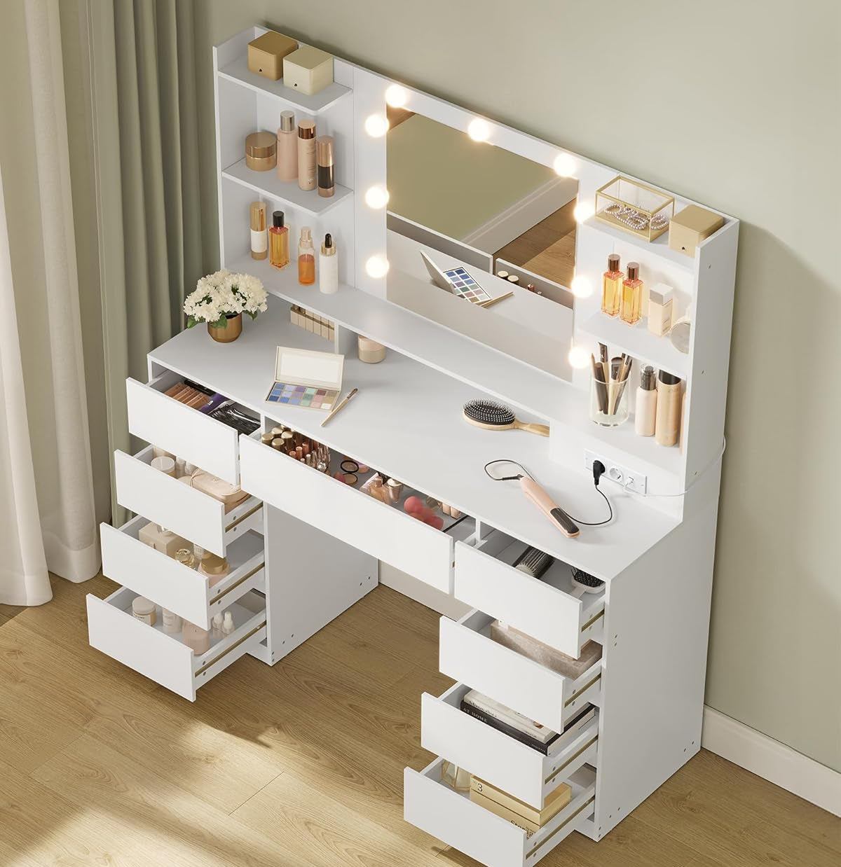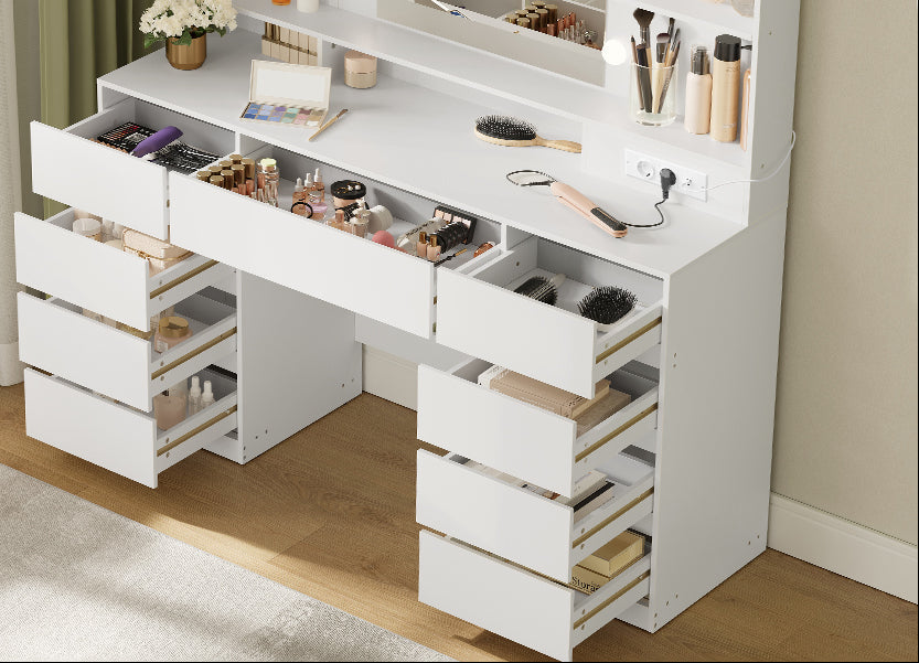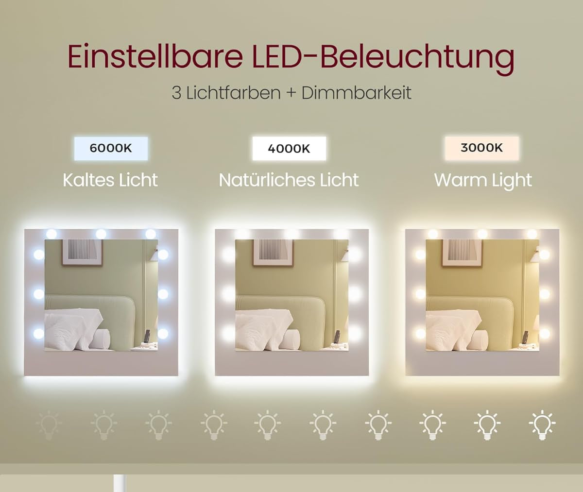 Τραπέζι Μπουντουάρ Μακιγιάζ Tουαλέτας με Καθρέφτη και φώτα LED Πολύπριζο Συρτάρια 3 χρώματα Φωτός RD-T141WB02