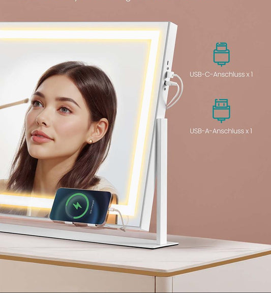 Μεγάλος Καθρέφτης Μακιγιάζ Φορητός για Τραπέζι Μπουντουάρ 80x60 εκ Περιστρεφόμενος με LED Ρυθμιζόμενο Φωτισμό και Θύρες Φόρτισης LW-M003WC02