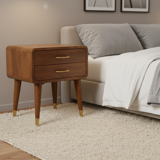 Στρογγυλό Κομοδίνο Τραπεζάκι Υπνοδωματίου Βοηθητικό με 2 Συρτάρια Μασίφ Ξύλο Φινίρισμα Καστανιά IN907