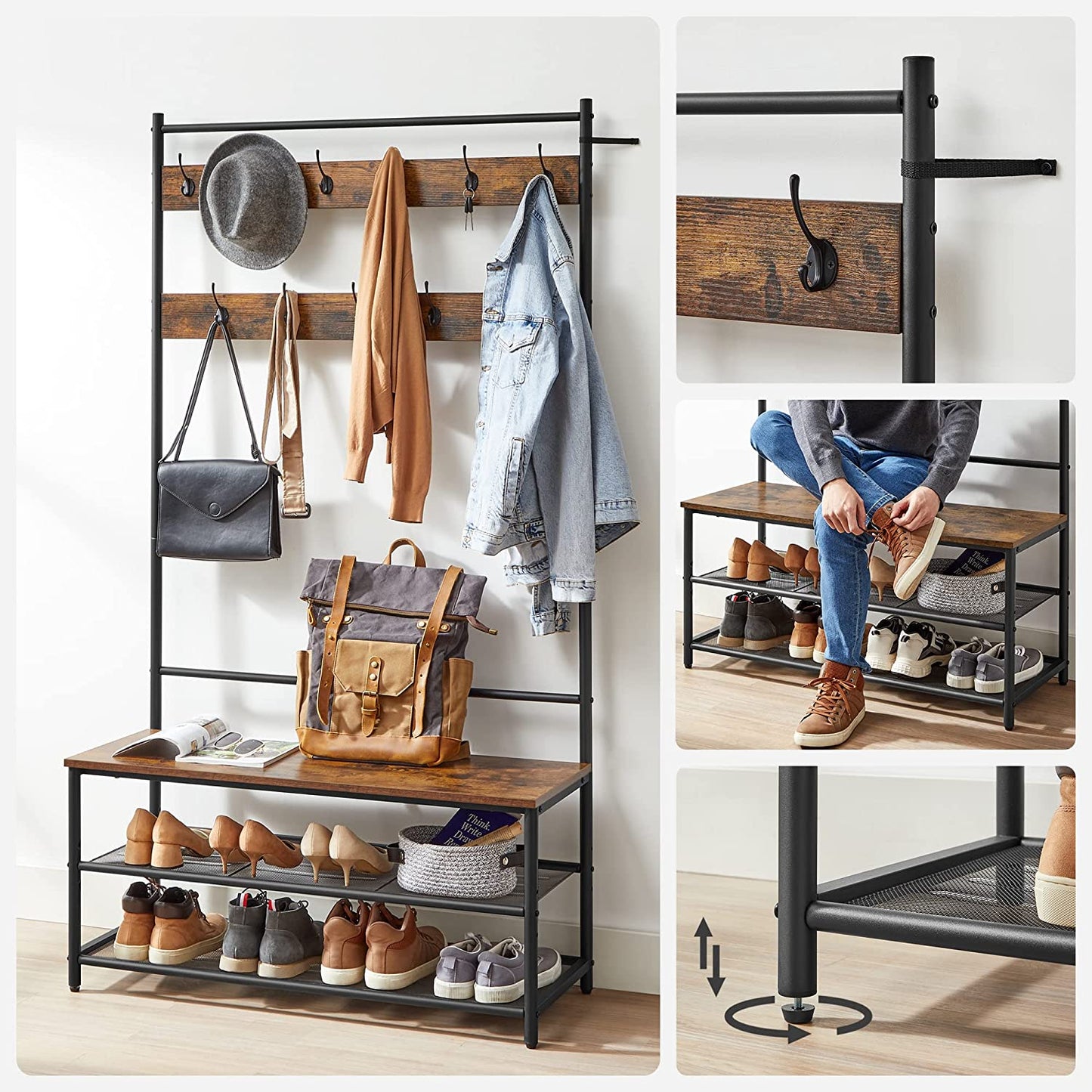 11 double hooks, 2 adjustable mesh shelves and a 100cm long bench - This rack is not only for storing your things you need at the entrance of the house, but also as a bench to sit on