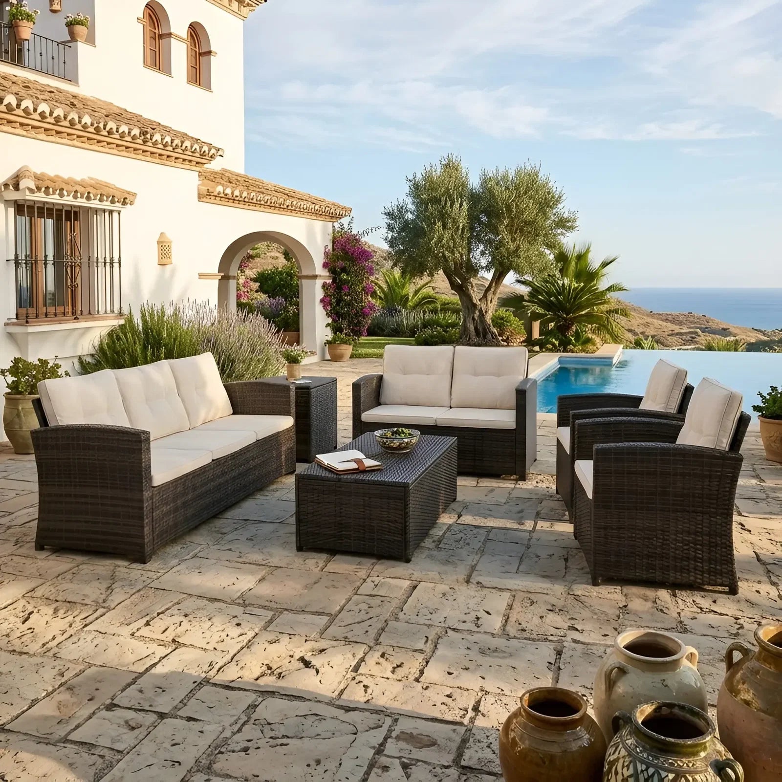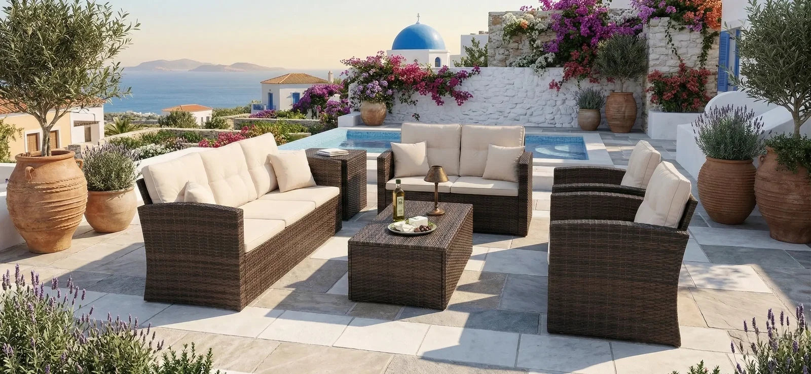 Μετατρέψτε τον εξωτερικό σας χώρο σε ένα κομψό καταφύγιο με αυτό το μοντέρνο σετ σαλονιού. Σχεδιασμένο με προσοχή, περιλαμβάνει έναν τριθέσιο καναπέ, έναν διθέσιο καναπέ, δύο πολυθρόνες, ένα τραπεζάκι σαλονιού και ένα κουτί αποθήκευσης για τα απαραίτητα. Τέλεια προσαρμοσμένο για να ενισχύσει τόσο την αισθητική όσο και τη λειτουργικότητα, αυτό το σετ προσφέρει τον απόλυτο συνδυασμό άνεσης και πρακτικότητας.
