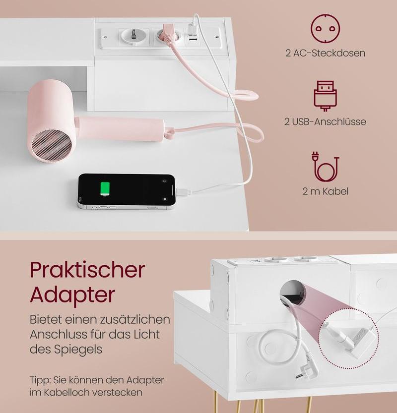 Χάρη στις 2 υποδοχές AC και τις 2 θύρες USB, τα πιστολάκια μαλλιών κ.λπ. μπορούν να χρησιμοποιηθούν απευθείας στο τραπέζι. Ένας πίσω προσαρμογέας παρέχει μια πρόσθετη σύνδεση για το φως του καθρέφτη, έτσι ώστε το καλώδιο του να μπορεί να παραμείνει κρυφό