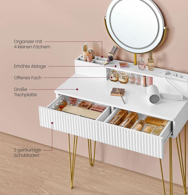 Ευρύχωρο 2 μεγάλα συρτάρια, 1 οργανωτή με 4 μικρές θήκες και 1 ανοιχτή θήκη - Αυτό το μπουντουάρ προσφέρει αρκετό χώρο για τα καλλυντικά σας. Όλα μπορούν να αποθηκευτούν τακτοποιημένα και εύκολα προσβάσιμα