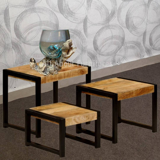 Βοηθητικά Τραπεζάκια Σετ 3 τεμ. Μασίφ Ξύλο και Μέταλλο Βιομηχανικό Στυλ 1247404