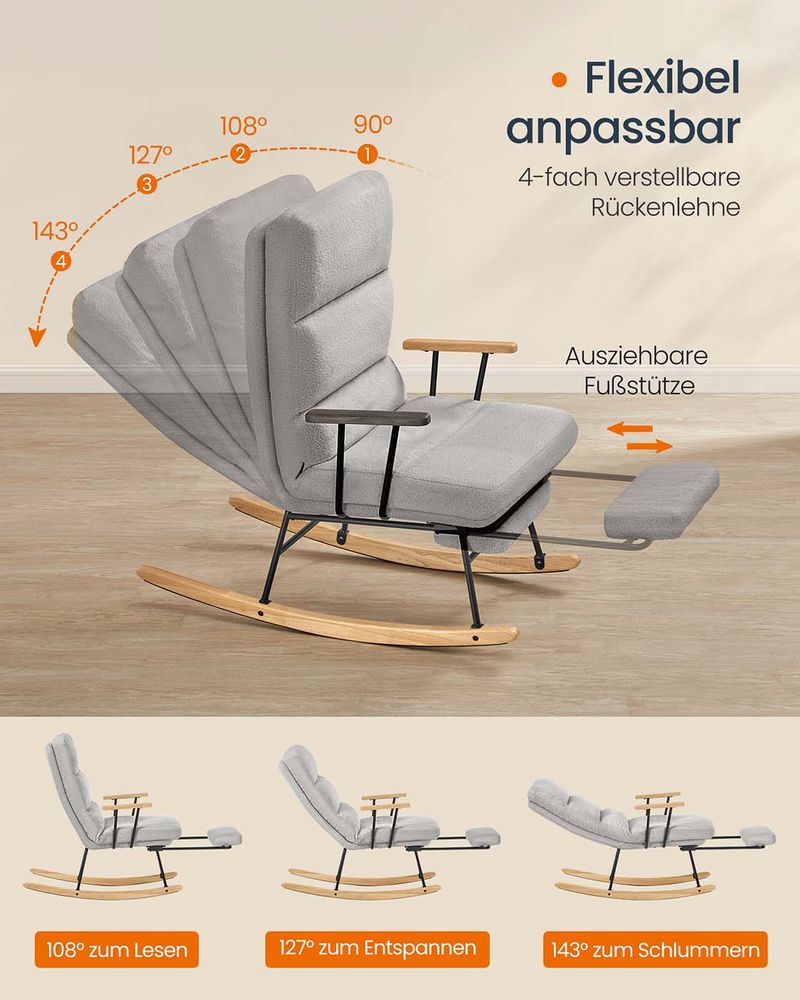 - Επεκτεινόμενο υποπόδιο: Επεκτείνετε το υποπόδιο της κουνιστής καρέκλας, σηκώστε τα πόδια σας - μπορείτε να πάρετε έναν άνετο υπνάκο σε αυτήν την καρέκλα