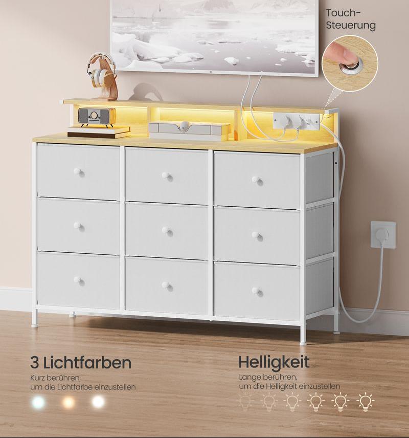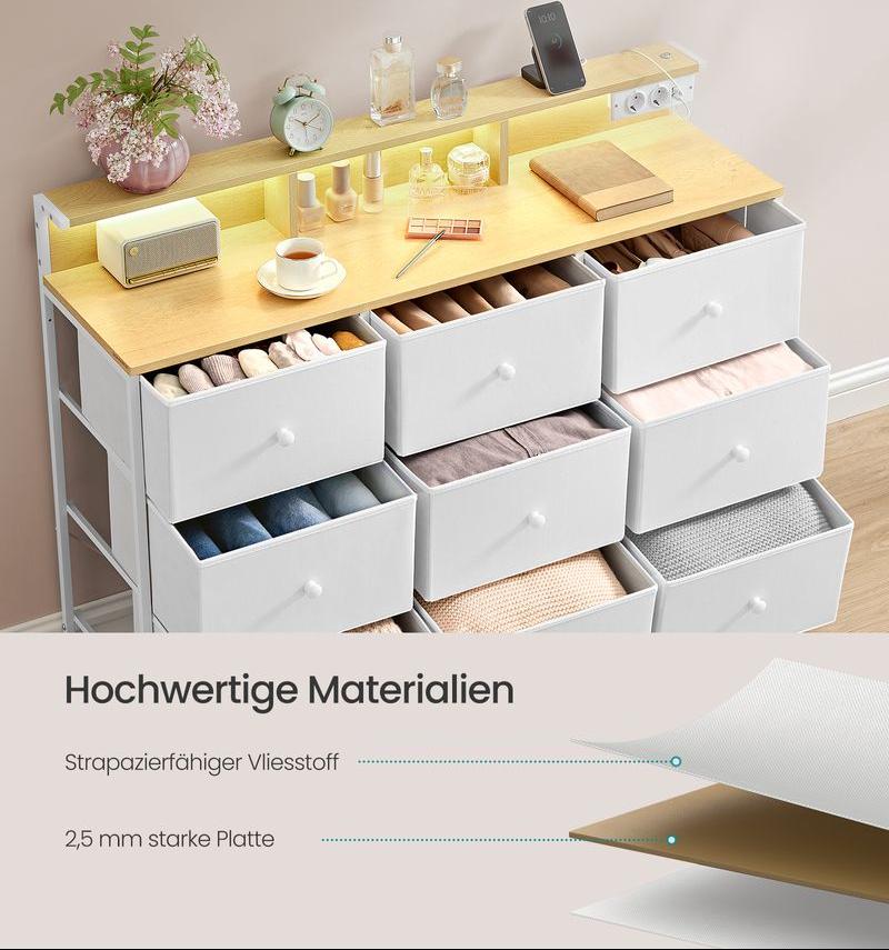 9 ευρύχωρα συρτάρια για ταξινόμηση και αποθήκευση ρούχων, κουβέρτες, κασκόλ κ.λπ., ανοιχτές θήκες για εύκολη πρόσβαση σε προϊόντα περιποίησης δέρματος και αρώματα, υπερυψωμένο ράφι για άλλα μικροαντικείμενα - όλα έχουν τη θέση τους.