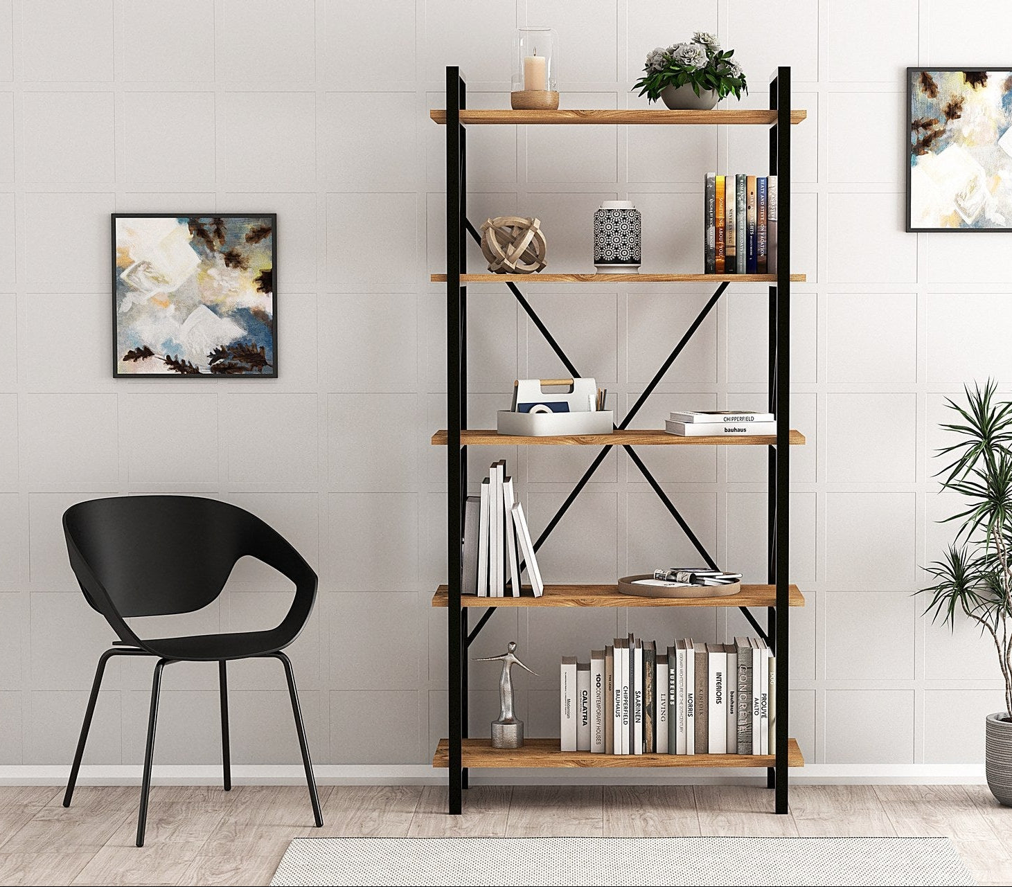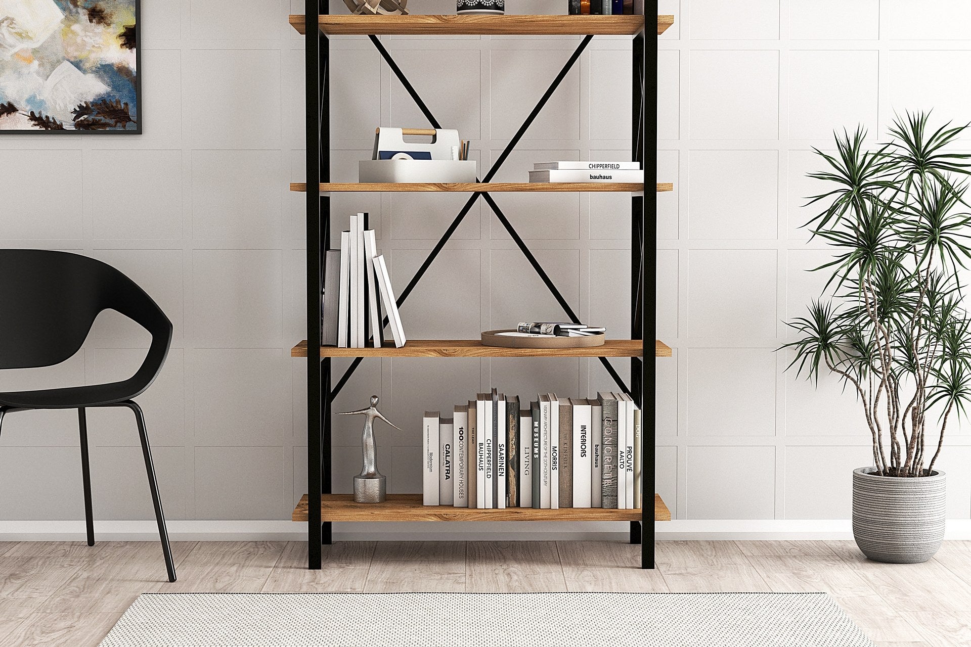 Ανεβάστε τον εσωτερικό σας χώρο με τη Βιομηχανική Βιβλιοθήκη μας, έναν τέλειο συνδυασμό μοντέρνας κομψότητας και ανθεκτικότητας. Κατασκευασμένη με κομψό μεταλλικό σκελετό και μοριοσανίδα 100% επικαλυμμένη με μελαμίνη, αυτή η βιβλιοθήκη προσφέρει όχι μόνο αντοχή αλλά και μια πινελιά κομψότητας σε κάθε δωμάτιο.