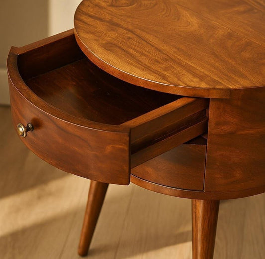 Στρογγυλό Κομοδίνο Τραπεζάκι Υπνοδωματίου Βοηθητικό με 2 Συρτάρια Μασίφ Ξύλο Φινίρισμα Καστανιά IN907