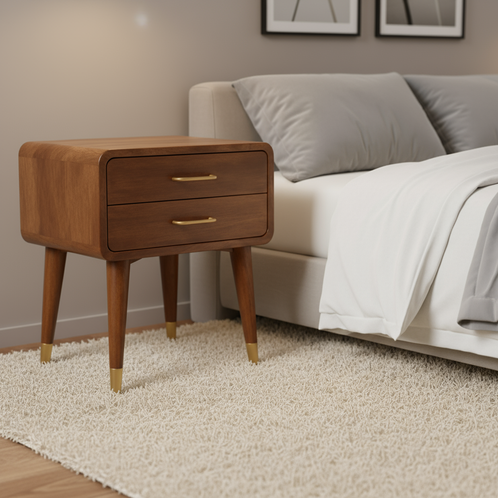 Ανακαλύψτε τον τέλειο συνδυασμό κομψότητας και πρακτικότητας με το χειροποίητο κομοδίνο μας από μασίφ ξύλο μάνγκο. Αποπνέοντας διαχρονική γοητεία mid century, αυτό το κομμάτι έχει φινίρισμα σε πλούσιο τόνο καβουρδισμένου αμυγδάλου, ενισχύοντας τη ζεστασιά της ατμόσφαιρας του υπνοδωματίου σας. Οι απαλές στρογγυλεμένες άκρες και τα κωνικά πόδια του, που συμπληρώνονται από λεπτομέρειες με ορείχαλκο, δημιουργούν μια εκλεπτυσμένη σιλουέτα που ενσωματώνεται αβίαστα τόσο σε μοντέρνους όσο και σε κλασικούς εσωτερικούς χώρους.