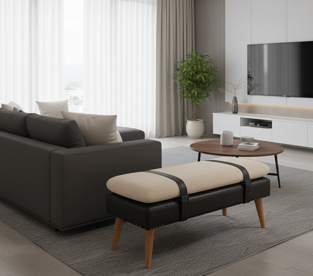 Πλήρη Στοιχεία: Οι λεπτομέρειες από δέρμα βουβαλιού εμπλουτίζουν την κομψότητα και την ανθεκτικότητα του παγκακιού.