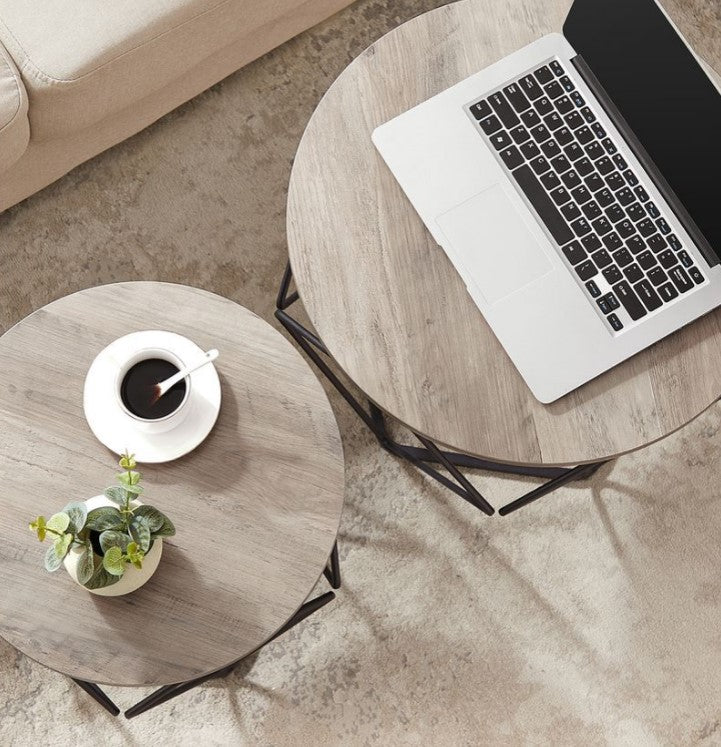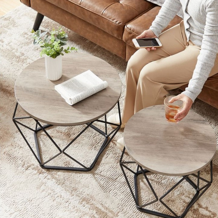 Αυτό το σετ τραπεζιού σαλονιού με industrial vintage αίσθηση θα προσθέσει μια ιδιαίτερη πινελιά στο δωμάτιό σας. Το στρογγυλό γκρι τοπ και η γεωμετρική μαύρη βάση από ατσάλι θα κάνουν τα μάτια των καλεσμένων σας να λάμπουν!