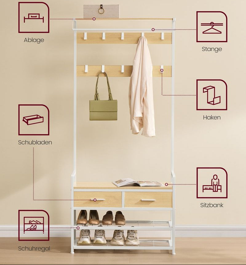 - Σχεδιασμός 6 σε 1: Η ντουλάπα συνδυάζει 10 γάντζους για ρούχα, 2 συρτάρια, μια ράγα ρούχων, έναν πάγκο, μια παπουτσοθήκη και ένα ράφι για να βελτιστοποιήσει τον χώρο σας και να σας βοηθήσει να δημιουργήσετε μια τακτοποιημένη και λειτουργική είσοδο.