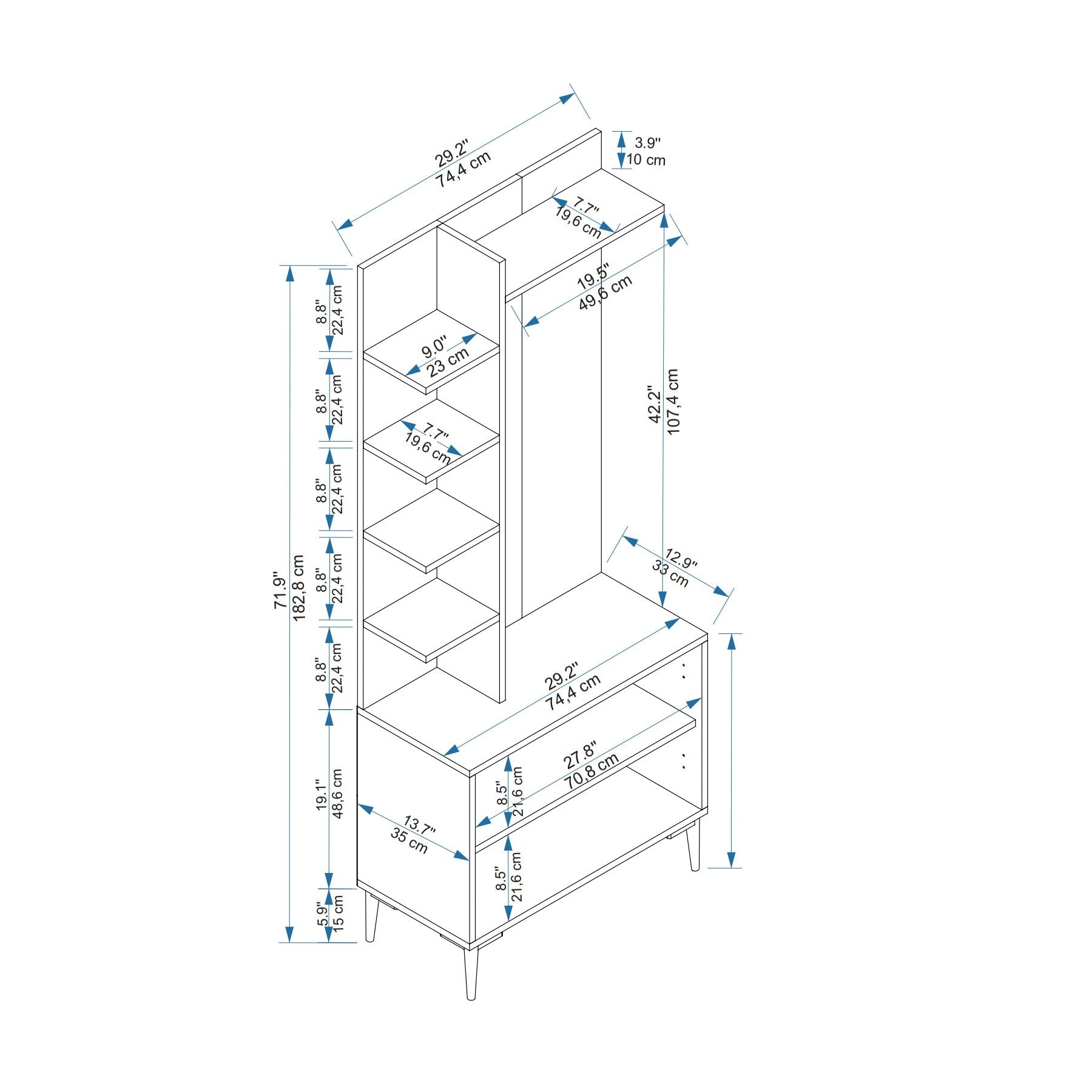Ευρύχωρος αποθηκευτικός χώρος: Με πλάτος 74,4 cm, προσφέρει άφθονο χώρο για παπούτσια, τσάντες και άλλα. Το ύψος της 182,8 cm διασφαλίζει ότι όλα είναι εύκολα προσβάσιμα.