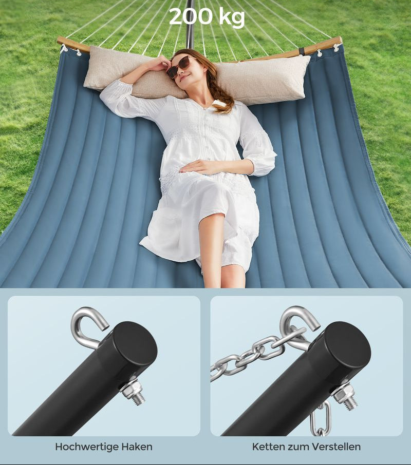 - [Ευέλικτη χρήση] Χάρη στους δύο γάντζους και τις αλυσίδες που περιλαμβάνονται στην παράδοση, μπορείτε εύκολα να ρυθμίσετε το ύψος της αιώρας κήπου ανάλογα με τις ανάγκες.
