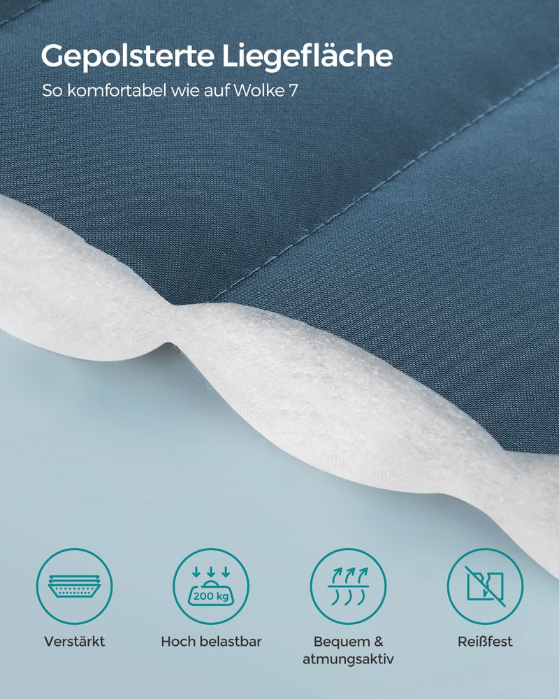 - [Η άνεση είναι ύψιστης σημασίας] Η καμπυλωτή, επενδεδυμένη επιφάνεια ξαπλώματος και το μαλακό μαξιλάρι προσφέρουν ανώτερη άνεση όταν απολαμβάνετε έναν ήρεμο υπνάκο σε εξωτερικούς χώρους. Η επιφάνεια πλάτους 140 cm είναι επίσης αρκετά μεγάλη για να απολαύσουν δύο άτομα χαλαρωτικές ώρες μαζί.