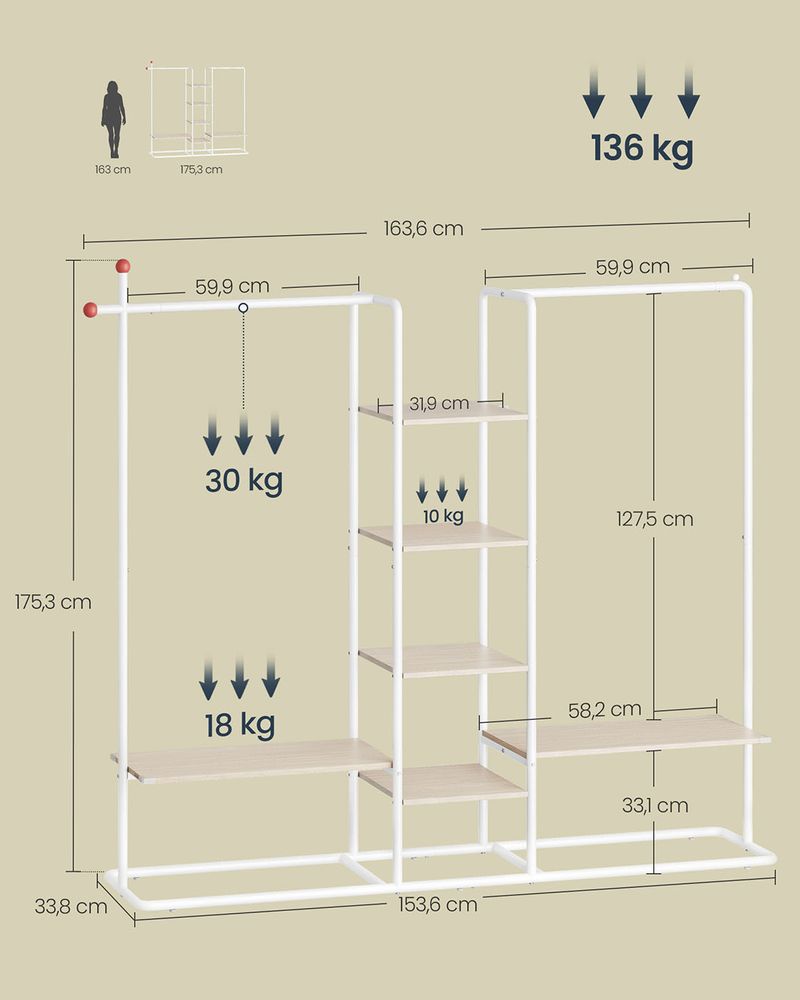 - Άφθονος αποθηκευτικός χώρος: Αρκετά ράφια και ράγες προσφέρουν χώρο για ρούχα, τσάντες και καθημερινά αντικείμενα.