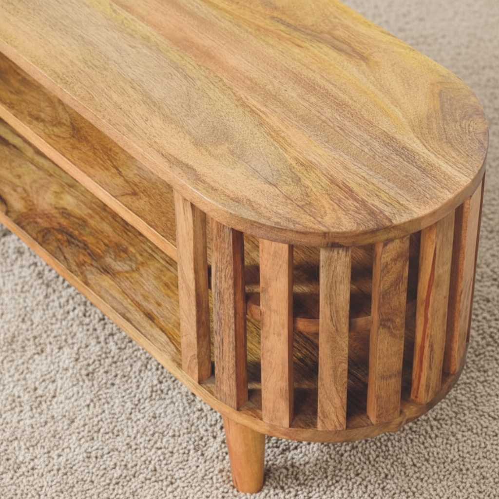 Αναβαθμίστε τον χώρο σας με τη χειροποίητη βάση τηλεόρασης μας, κατασκευασμένη από 100% μασίφ ξύλο μάνγκο με φυσικό φινίρισμα μάνγκο. Αυτό το εξαιρετικό κομμάτι αποτυπώνει την γαλήνια ομορφιά της σύγχρονης ιαπωνικής αισθητικής με το ανοιχτό πλαίσιο με σχάρες, επιτρέποντας στο φως να κοσμεί τον εσωτερικό σας χώρο για μια καθαρή και ευάερη ατμόσφαιρα. Ιδανικά κατάλληλη για σπίτια εμπνευσμένα από την Ιαπωνία και τη Σκανδιναβία, αυτή η βάση τηλεόρασης αποπνέει κομψότητα και ισορροπία.