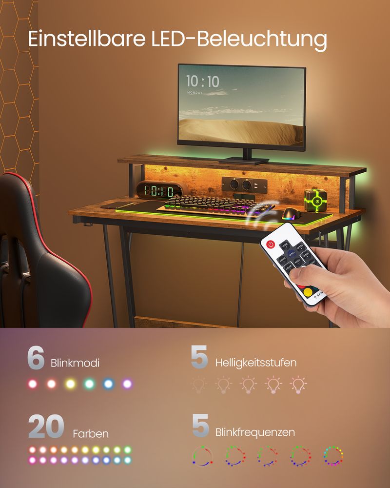 Αυτό το γραφείο είναι εξοπλισμένο με φωτισμό LED σε 20 χρώματα, 6 λειτουργίες και 5 συχνότητες που αναβοσβήνουν, η φωτεινότητα των οποίων μπορεί να ρυθμιστεί σε 5 επίπεδα για να δημιουργήσει μια τέλεια ατμόσφαιρα παιχνιδιού.