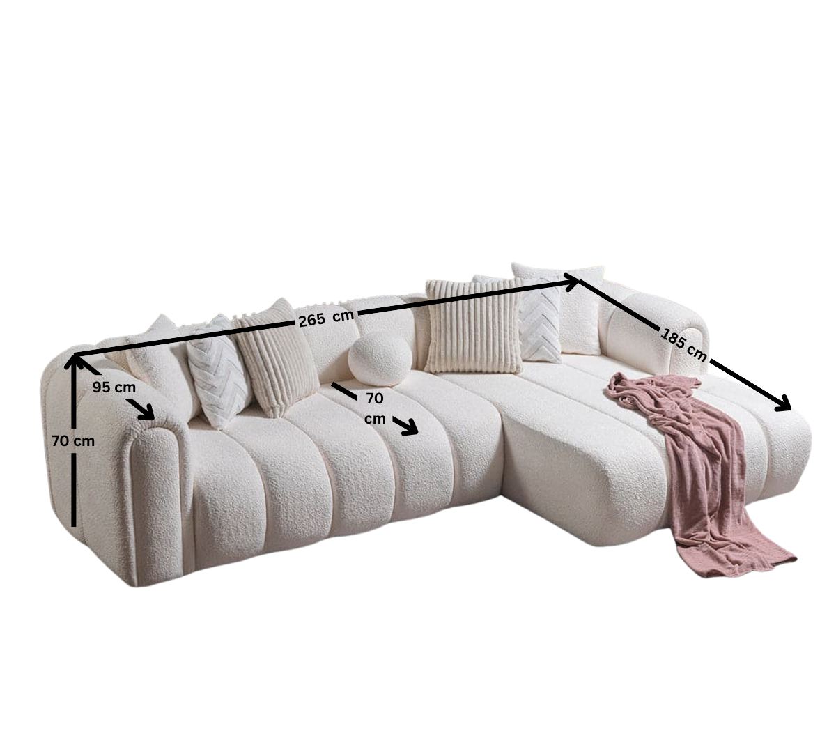 Μεταμορφώστε τον χώρο σας με τον εκπληκτικό γωνιακό καναπέ μας, σχεδιασμένο να προσφέρει στυλ και άνεση στο σπίτι σας. Αυτός ο καναπές είναι κατασκευασμένος για να διαρκεί για χρόνια με ανθεκτικό σκελετό που αποτελείται από 70% δρυ και 30% μελαμίνη. Το ύφασμα είναι 100% πολυεστέρας με πολυτελή υφή boucle, προσθέτοντας μια πινελιά κομψότητας σε κάθε δωμάτιο.