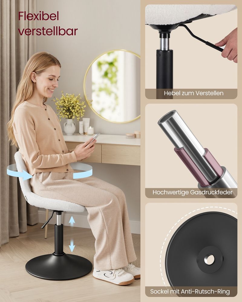 • Περιστρεφόμενο κατά 360° και ρυθμιζόμενο ύψος: Το σκαμπό νιπτήρα μπορεί να περιστραφεί ελεύθερα και το ύψος του να ρυθμιστεί μεταξύ 37,5 και 49,5 cm – έτσι ώστε να ταιριάζει αβίαστα στο τραπέζι νιπτήρα σας.