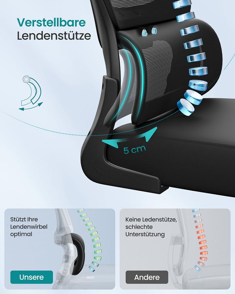 - Εργονομική οσφυϊκή υποστήριξη: Η καμπύλη, ρυθμιζόμενη οσφυϊκή υποστήριξη της καρέκλας υπολογιστή υποστηρίζει τη σπονδυλική σας στήλη σε οποιαδήποτε καθιστή θέση και έτσι αποτρέπει την ένταση στην οσφυϊκή περιοχή όταν κάθεστε για μεγάλα χρονικά διαστήματα.