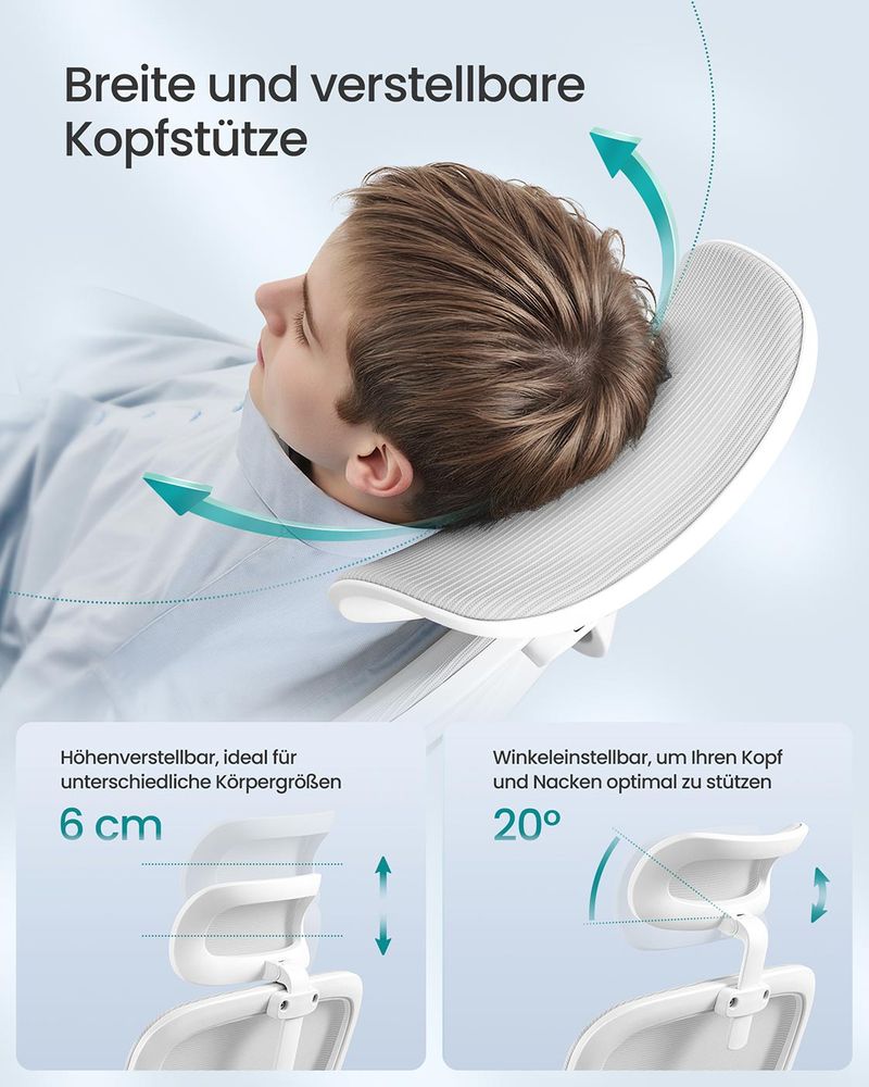 - Ρυθμιζόμενη πλάτη και προσκέφαλο: Η καρέκλα διαθέτει επίσης ανακλινόμενη πλάτη 90° έως 115° και προσκέφαλο ρυθμιζόμενο σε ύψος και γωνία - ρυθμίστε την καρέκλα με πλέγμα όπως απαιτείται για να βρείτε την ιδανική θέση καθίσματος.