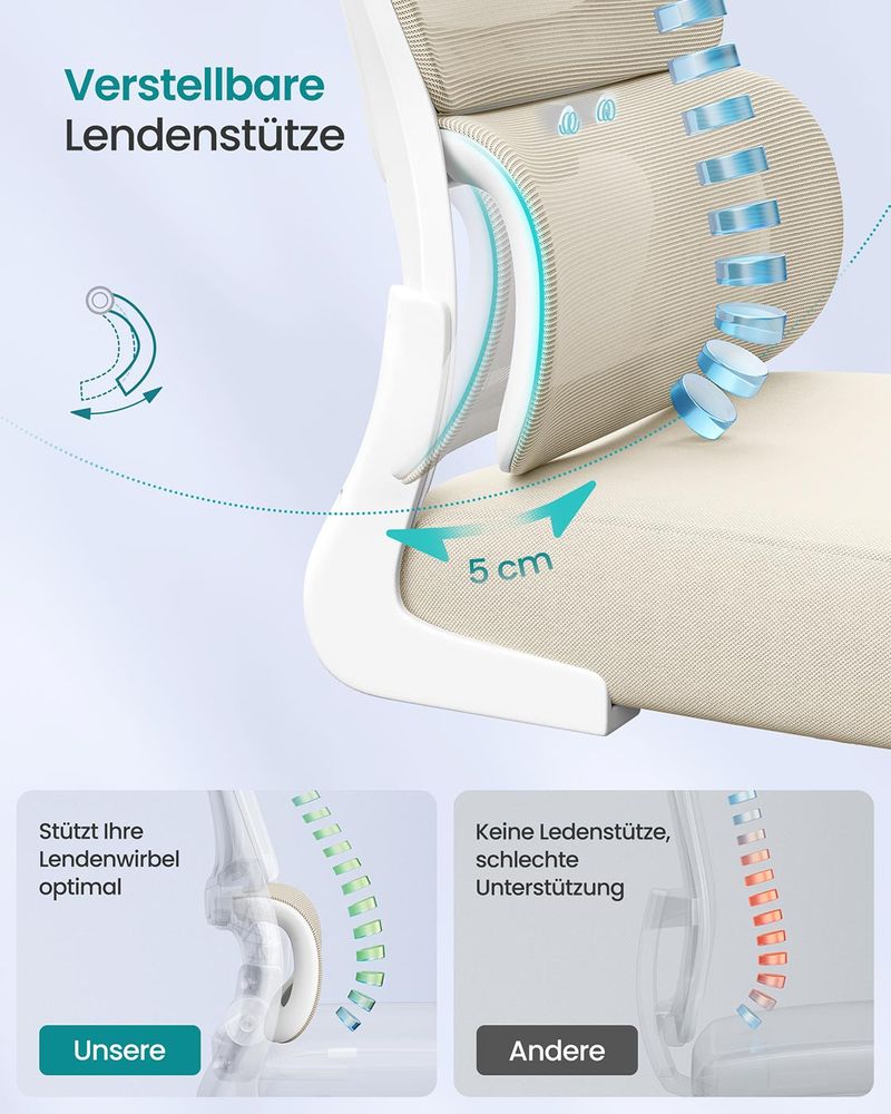 • Εργονομική οσφυϊκή υποστήριξη: Η καμπύλη, ρυθμιζόμενη οσφυϊκή υποστήριξη της καρέκλας υπολογιστή υποστηρίζει τη σπονδυλική σας στήλη σε οποιαδήποτε καθιστή θέση και έτσι αποτρέπει την ένταση στην οσφυϊκή περιοχή όταν κάθεστε για μεγάλα χρονικά διαστήματα.