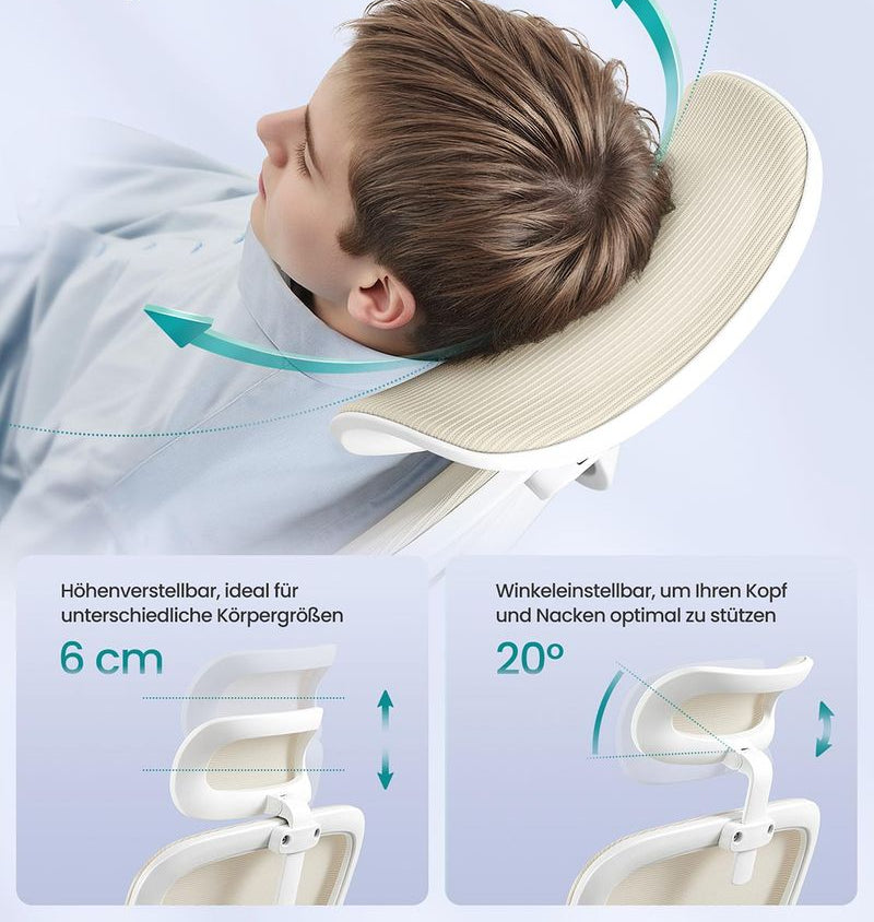 • Ρυθμιζόμενη πλάτη και προσκέφαλο: Η καρέκλα διαθέτει επίσης ανακλινόμενη πλάτη 90° έως 115° και προσκέφαλο ρυθμιζόμενο σε ύψος και γωνία - ρυθμίστε την καρέκλα με πλέγμα όπως απαιτείται για να βρείτε την ιδανική θέση καθίσματος.
