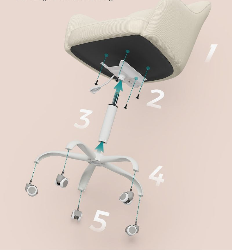 - Εύκολη συναρμολόγηση: Στερεώστε την πλάκα βάσης στην κάτω πλευρά του καθίσματος με βίδες, τοποθετήστε το ελατήριο αερίου και τους τροχούς – σε λίγα μόνο βήματα η καρέκλα είναι πλήρως συναρμολογημένη.