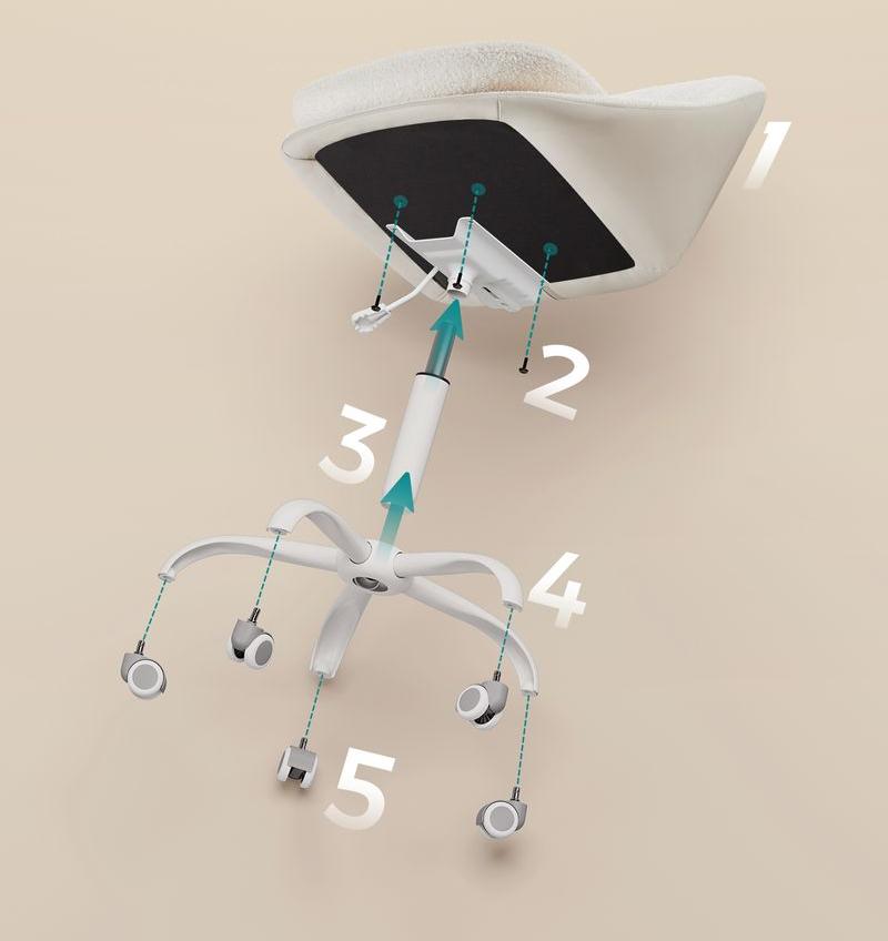 - Στερεώστε την πλάκα βάσης στο κάτω μέρος του καθίσματος με βίδες, τοποθετήστε τις φιάλες αερίου και τους τροχούς - η καρέκλα του υπολογιστή συναρμολογείται σε λίγα μόνο βήματα