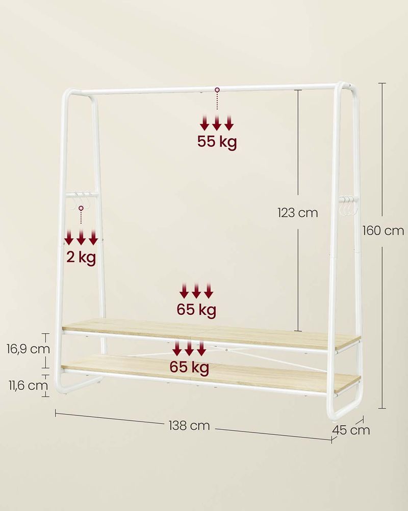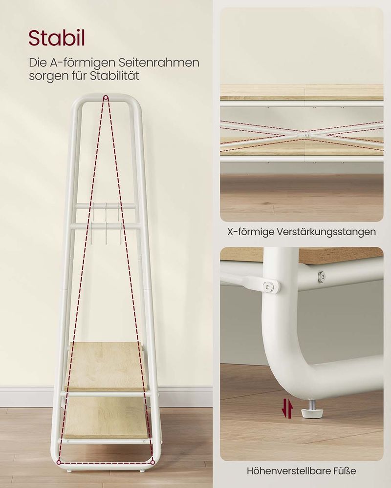 - [Στιβαρή και σταθερή] Αυτή η κρεμάστρα ρούχων είναι κατασκευασμένη από στιβαρή μοριοσανίδα. Το πλαίσιο σε σχήμα Α και η βάση με δύο ράφια εξασφαλίζουν υψηλή σταθερότητα. Με ικανότητα φορτίου 197 κιλών, δεν χρειάζεται να ανησυχείτε για το τίναγμα της κρεμάστρας.