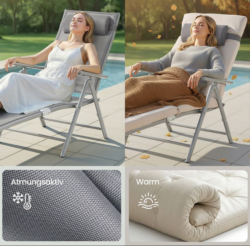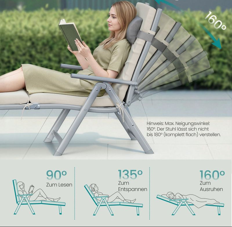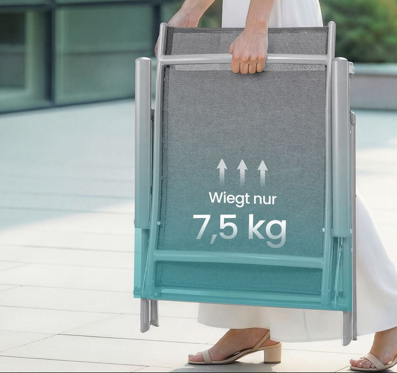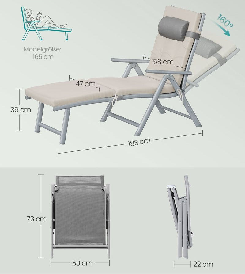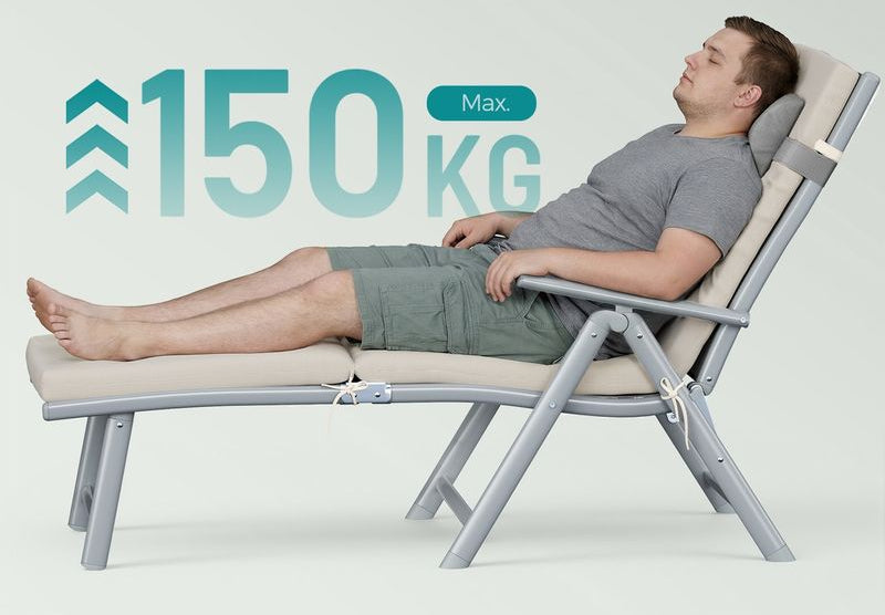 - Πτυσσόμενη και φορητή: Μπορείτε να διπλώσετε την ξαπλώστρα (22 x 58 x 73 εκ.) όταν δεν τη χρησιμοποιείτε και να την αποθηκεύσετε σε μικρό χώρο. Η καρέκλα ζυγίζει μόνο 7,5 κιλά και είναι εύκολη στη μεταφορά.