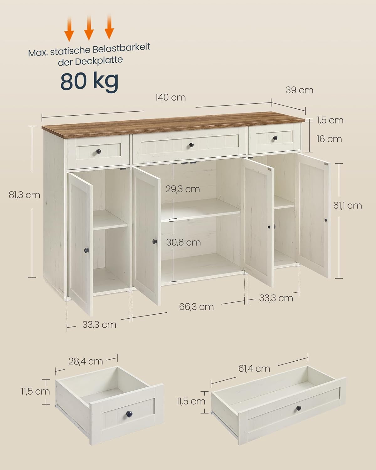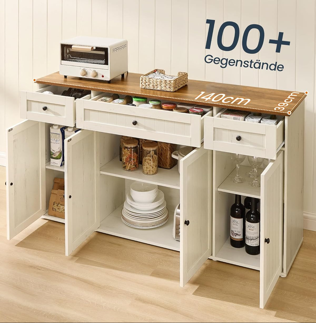 Με διαστάσεις 39 x 140 x 81,3 εκ., ο μπουφές προσφέρει άφθονο αποθηκευτικό χώρο: