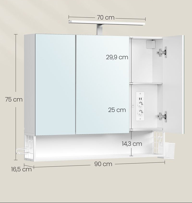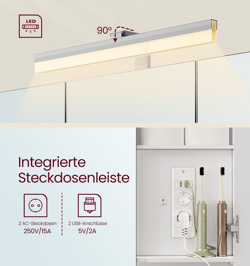 Χάρη στις πρακτικές 2 υποδοχές AC και 2 θύρες USB μέσα στο ντουλάπι, το πιστολάκι μαλλιών, το σίδερο για μπούκλες, η ηλεκτρική οδοντόβουρτσα και το ξυράφι μπορούν να φορτιστούν ή να συνδεθούν.