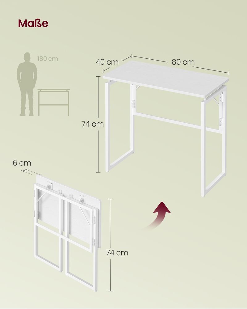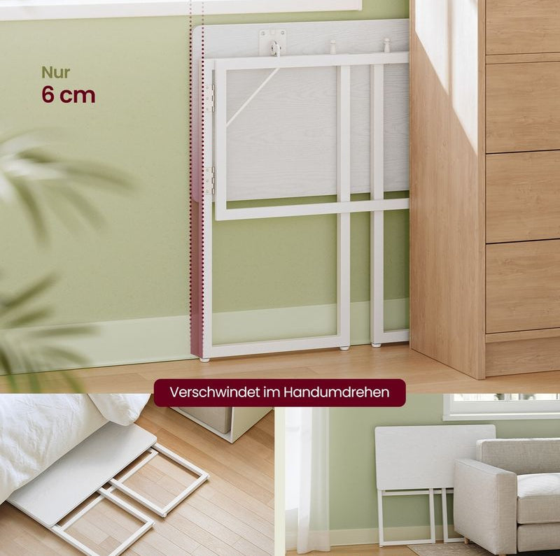 - Πτυσσόμενο και εξοικονομεί χώρο: Αυτό το μικρό γραφείο μπορεί να διπλωθεί σε βάθος μόλις 6 cm μετά τη χρήση και να αποθηκευτεί πίσω από πόρτες, δίπλα στο κρεβάτι ή κάτω από τον καναπέ – ιδανικό για μικρά διαμερίσματα.