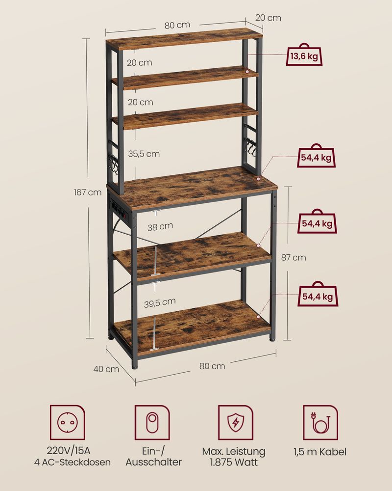 Με διαστάσεις 40 x 80 x 167 cm, αυτό το ράφι μικροκυμάτων με 6 επίπεδα και 4 πρίζες AC είναι ιδανικό για μικρές κουζίνες ή ως μίνι καφέ μπαρ. Με αυτό το ράφι αποθήκευσης μπορείτε να κάνετε βέλτιστη χρήση του χώρου