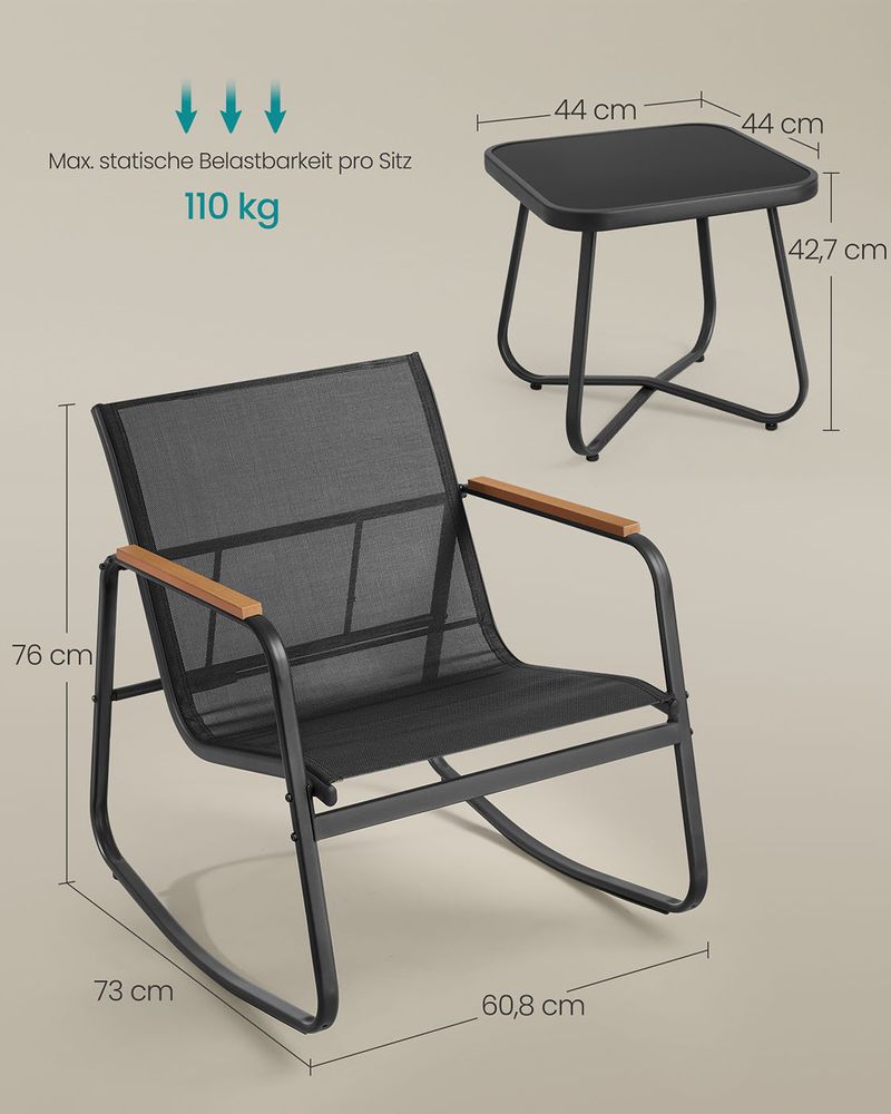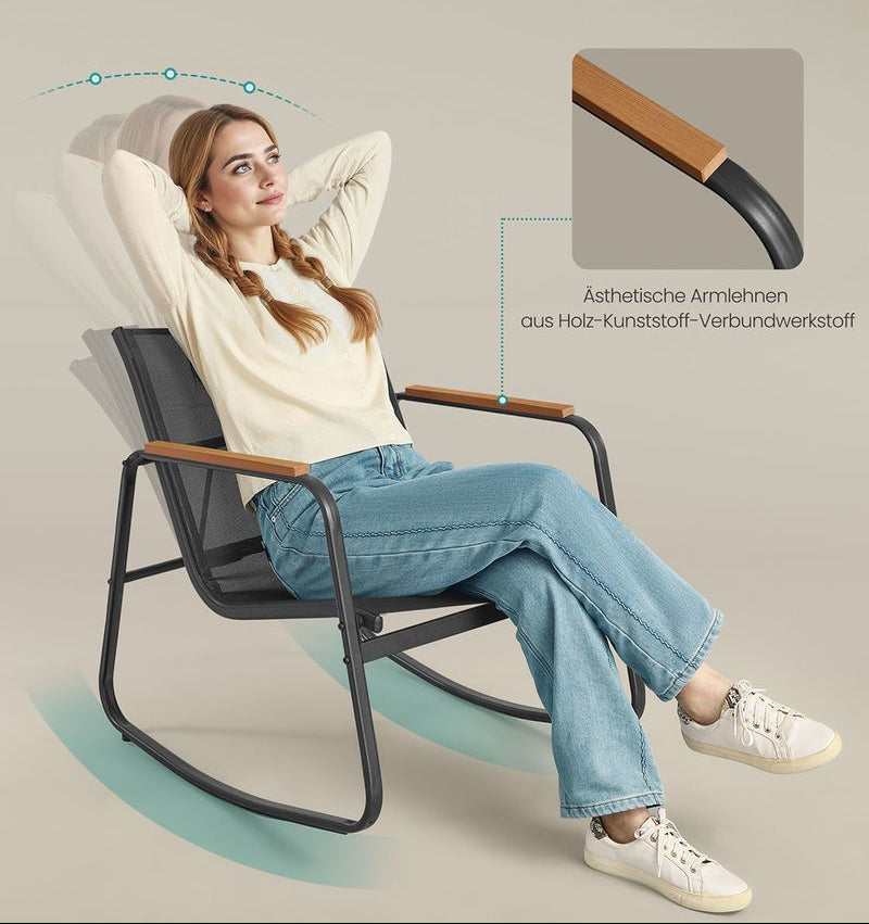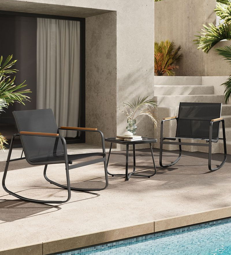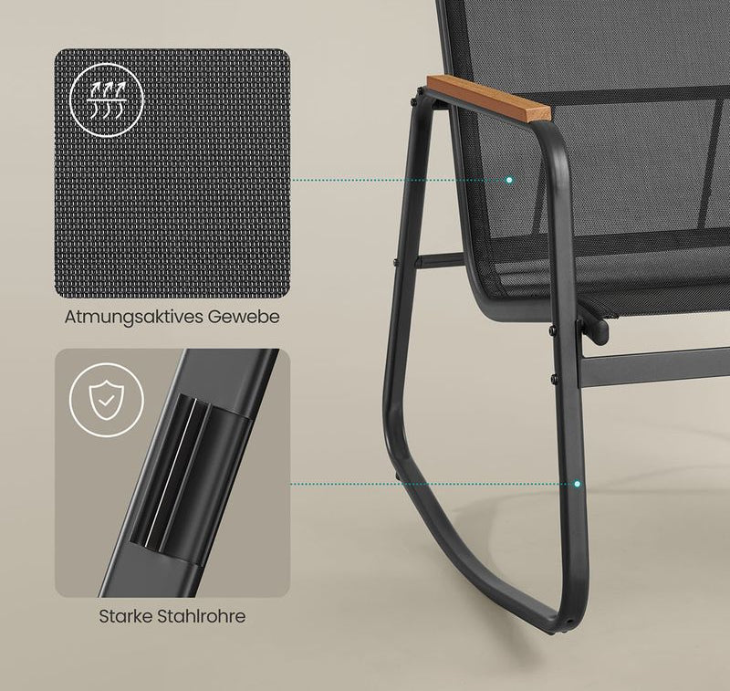 Οι δύο καρέκλες με λειτουργία λικνίσματος δημιουργούν μια χαλαρή και άνετη εξωτερική όαση. Ιδανικό για να χαλαρώσετε μετά από μια κουραστική μέρα και να απολαύσετε τον καθαρό αέρα.
