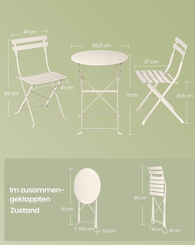 - Πτυσσόμενο και εύκολο στην αποθήκευση: το τραπέζι έχει πλάτος μόνο 3,5 cm, κάθε καρέκλα είναι μόνο 10 cm - ιδανικό αν έχετε περιορισμένο χώρο ή θέλετε να αποθηκεύσετε το σετ για εξοικονόμηση χώρου