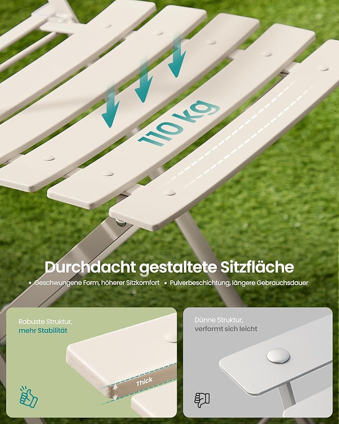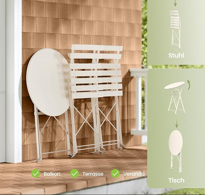 - Προσυναρμολογημένα και έτοιμα για χρήση: το τραπέζι και οι καρέκλες μπαλκονιού παραδίδονται προσυναρμολογημένα - απλώς ξεδιπλώστε τα και απολαύστε τη νέα σας γωνιά χαλάρωσης σε εξωτερικό χώρο σε χρόνο μηδέν.