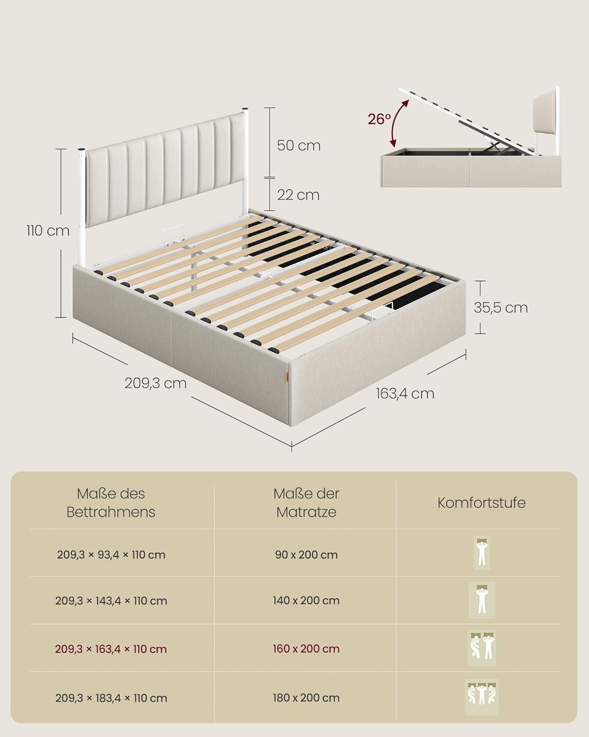 Εύκολη συναρμολόγηση: Δύο άτομα μπορούν να συναρμολογήσουν αυτό το σκελετό κρεβατιού σε μόλις μία ώρα. Χαλαρώστε καλά το κεφαλάρι με την ταπετσαρία για να επαναφέρετε το βέλτιστο σχήμα του εντός 48 ωρών ή χρησιμοποιήστε ατμοσίδερο για να αφαιρέσετε τις ζάρες.