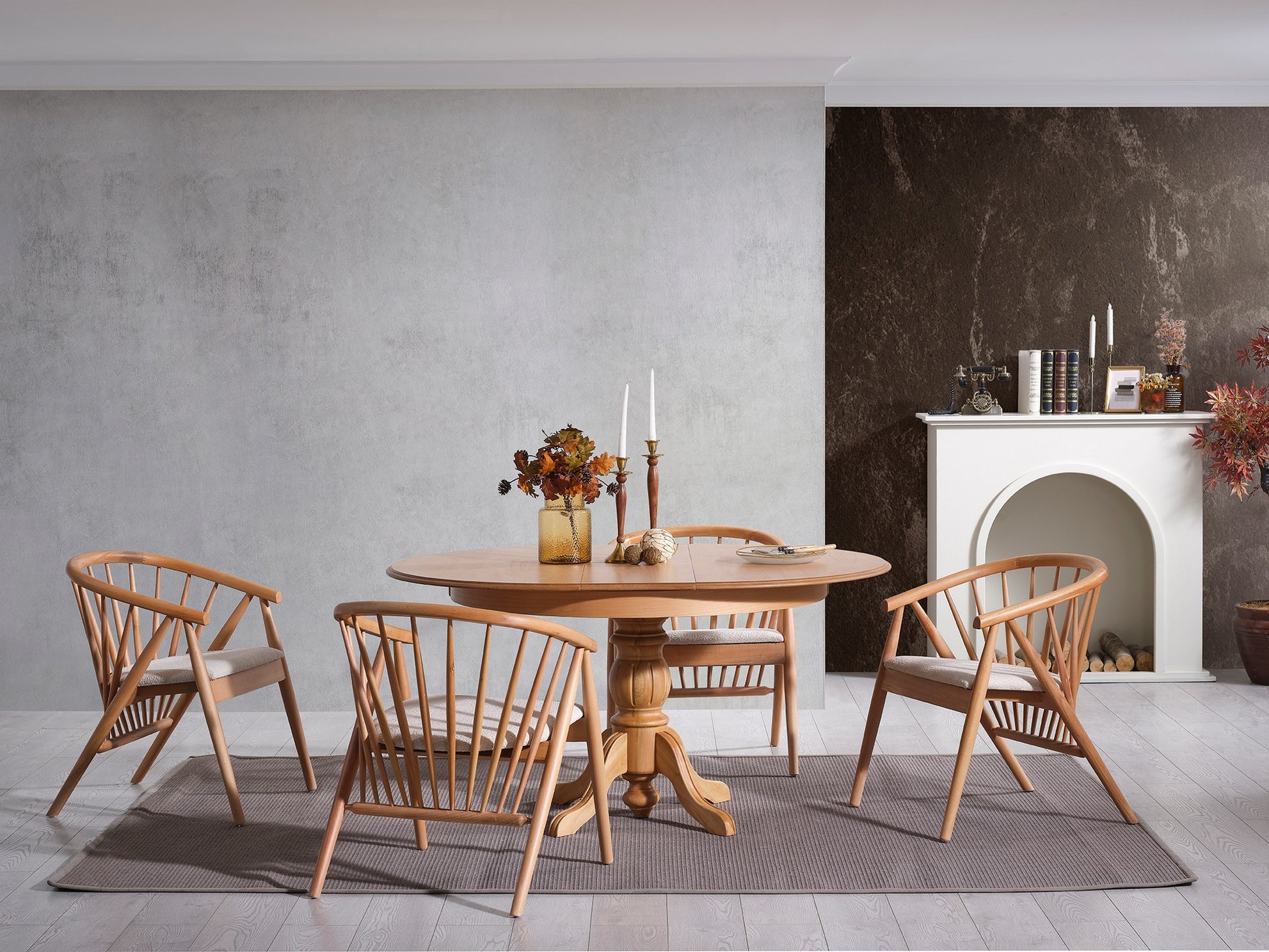 Μεταμορφώστε την τραπεζαρία σας σε έναν ζεστό και φιλόξενο χώρο με το εξαίσιο επεκτάσιμο τραπέζι και τις καρέκλες μας. Κατασκευασμένο από 100% ξύλο οξιάς, αυτό το σετ αποπνέει κομψότητα και ανθεκτικότητα, καθιστώντας το μια διαχρονική προσθήκη στο σπίτι σας.