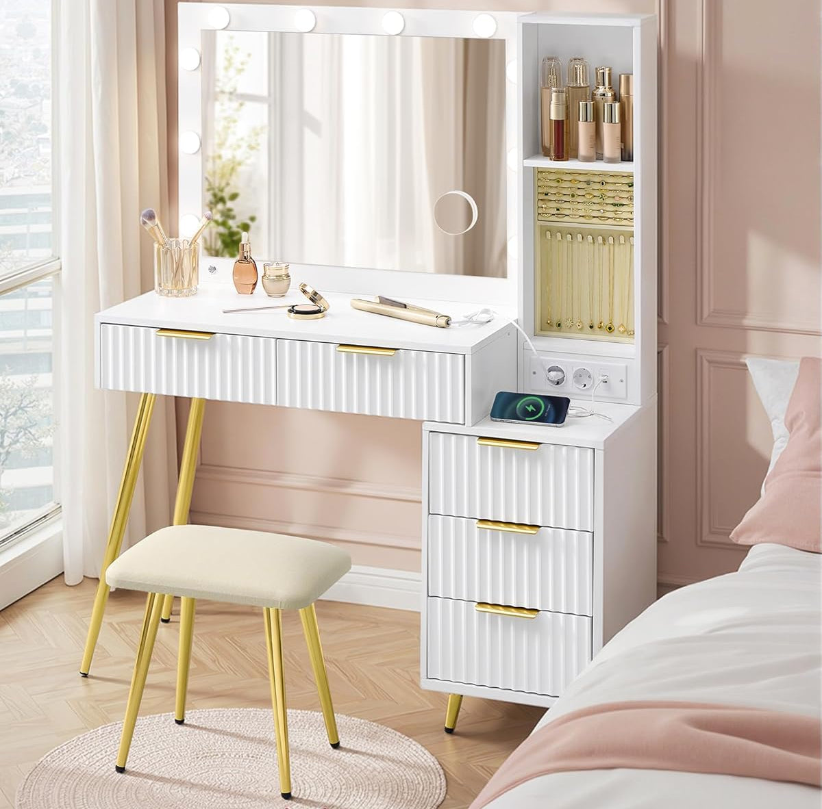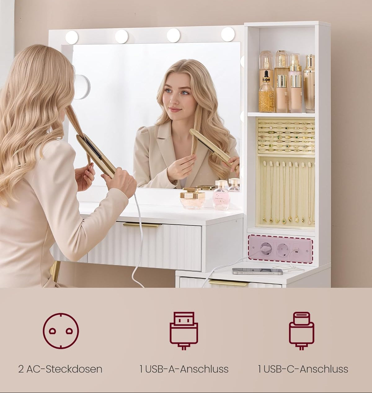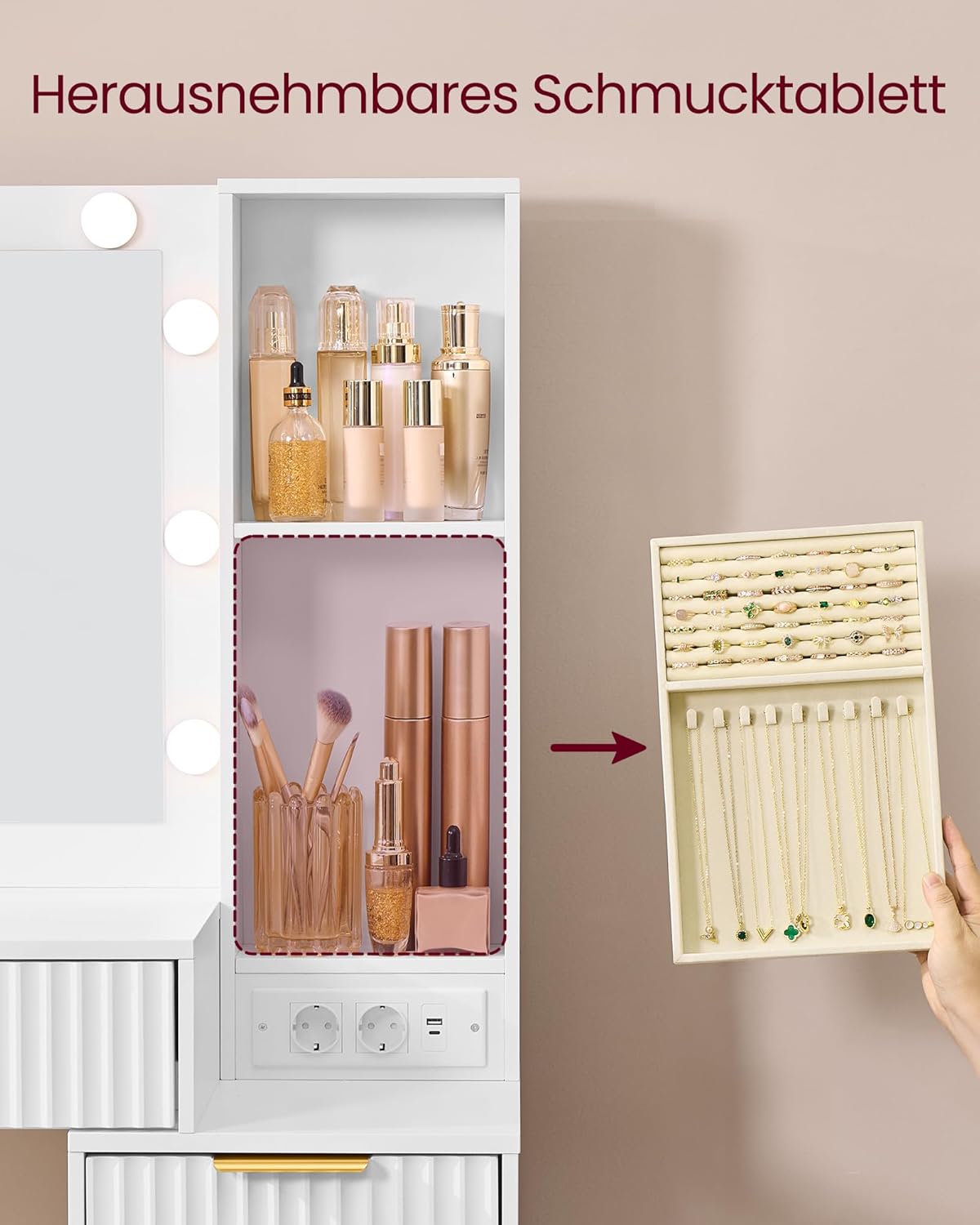 Άφθονος αποθηκευτικός χώρος Με επιφάνεια πλάτους 110 cm, 9 συρτάρια, 1 οργανωτή κοσμημάτων και 7 ανοιχτά διαμερίσματα (με 3 ρυθμιζόμενα ράφια), αυτό το μπουντουάρ παρέχει αρκετό χώρο για τα προϊόντα ομορφιάς σας.