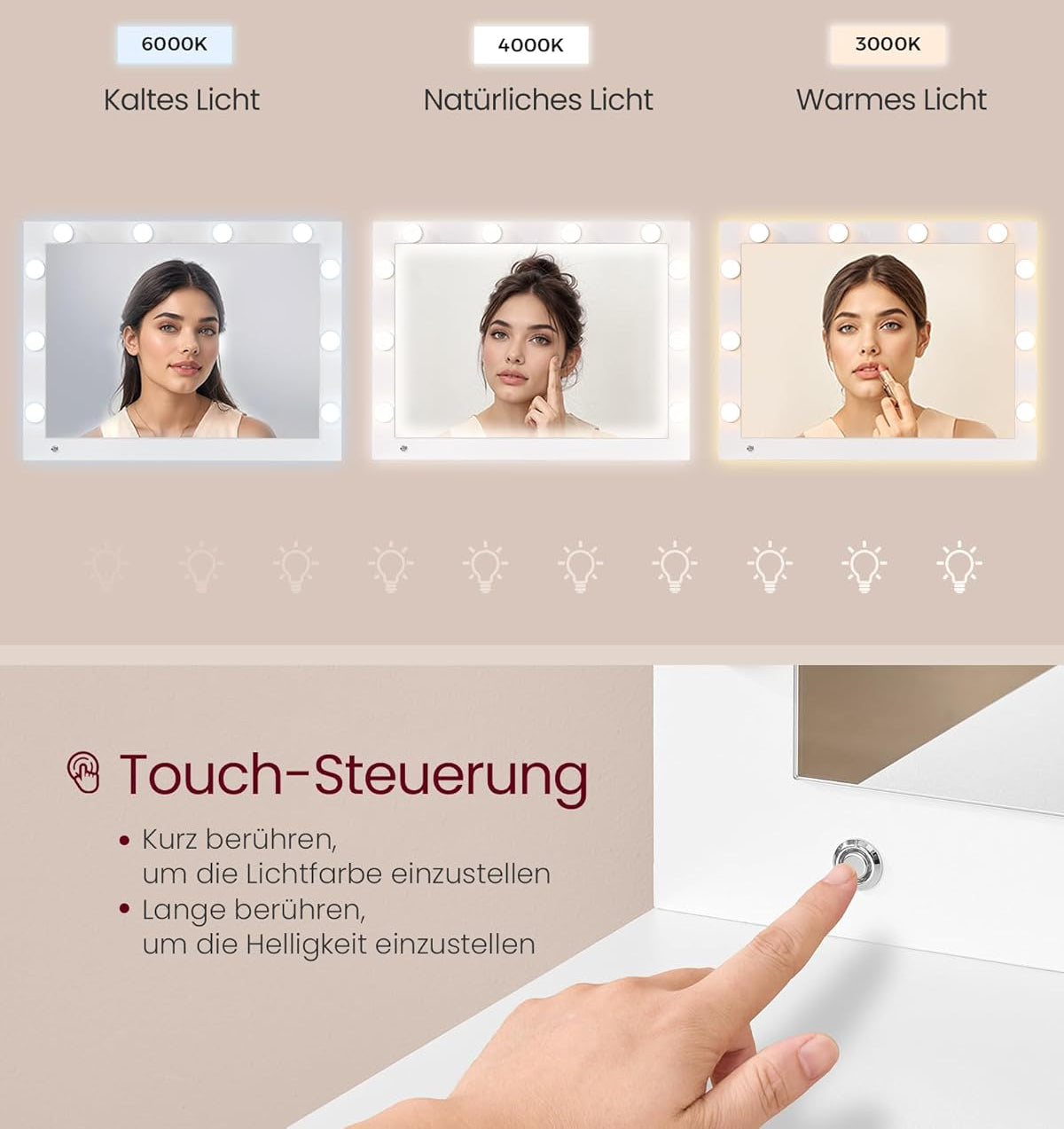 Καθρέφτης με φωτισμό LED: τα τρία ανοιχτά χρώματα (κρύο, φυσικό και ζεστό φως) και η φωτεινότητα μπορούν να ρυθμιστούν με το χειριστήριο αφής. Ο διαυγής καθρέφτης μπορεί να μετακινηθεί ευέλικτα στο πλάι.