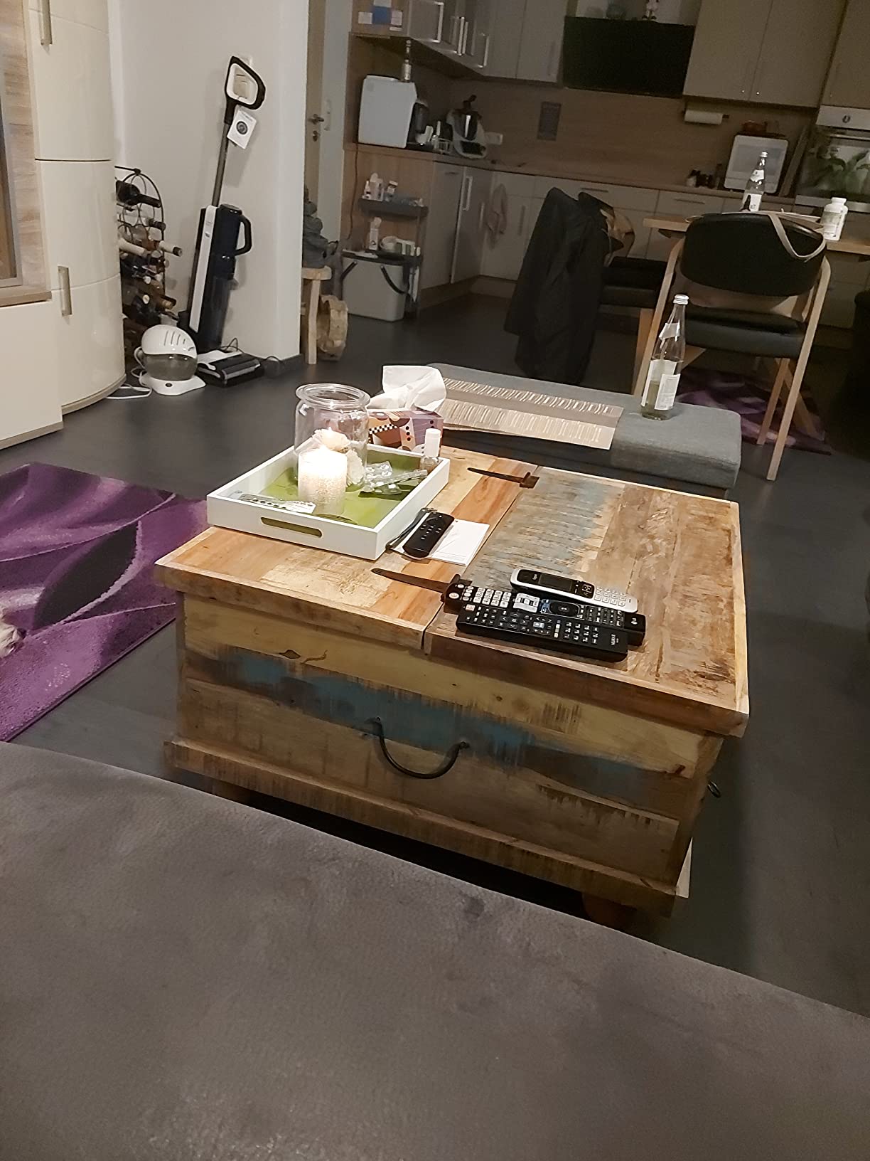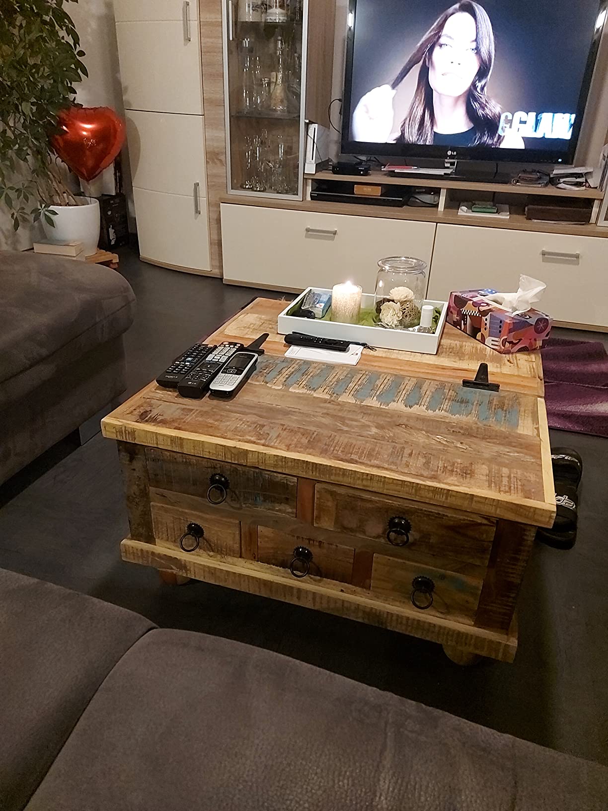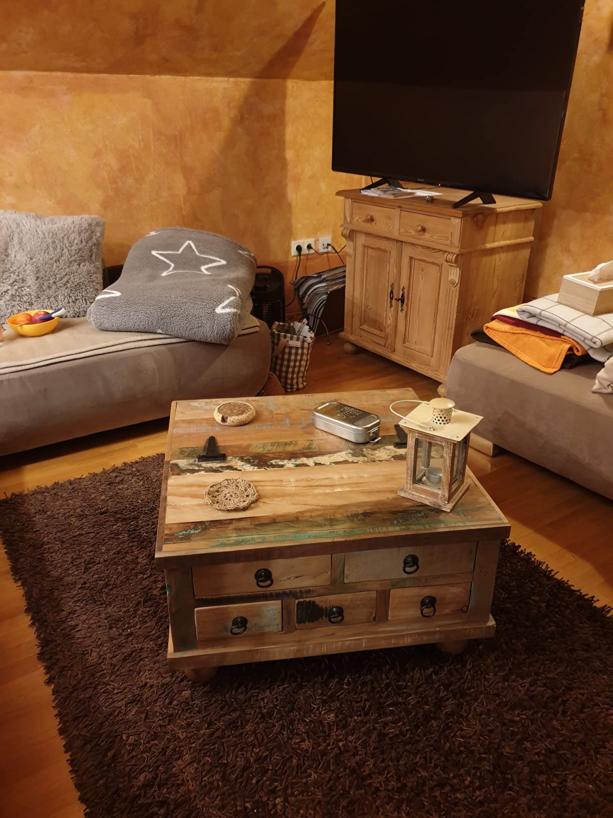 Το ρετρό Τραπέζι Σαλονιού Τραπεζάκι Καφέ είναι χειροποίητα κατασκευασμένο από ανακυκλωμένο ξύλο το οποίο είναι σταθερό, ανθεκτικό και όμορφο και διαθέτει χαρακτηριστικά από διαφορετικά είδη ξύλων όπως teak, ξύλο μάνγκο, ακακία, σκληρό ξύλο κλπ. Οι διαδικασίες του γυαλίσματος, του βαψίματος και του λουστραρίσματος είναι περίτεχνα ολοκληρωμένες, ενώ η δεξιοτεχνία κατασκευής του και τα όμορφα νερά του ξύλου καθιστούν κάθε έπιπλο μοναδικό και ελαφρώς διαφορετικό από το επόμενο. Επιπρόσθετα, τα 5 συρτάρια και το μεγάλο εσωτερικό τμήμα αποθήκευσης παρέχουν άπλετο χώρο για την αποθήκευση οποιωνδήποτε αντικειμένων σε κοντινή απόσταση.